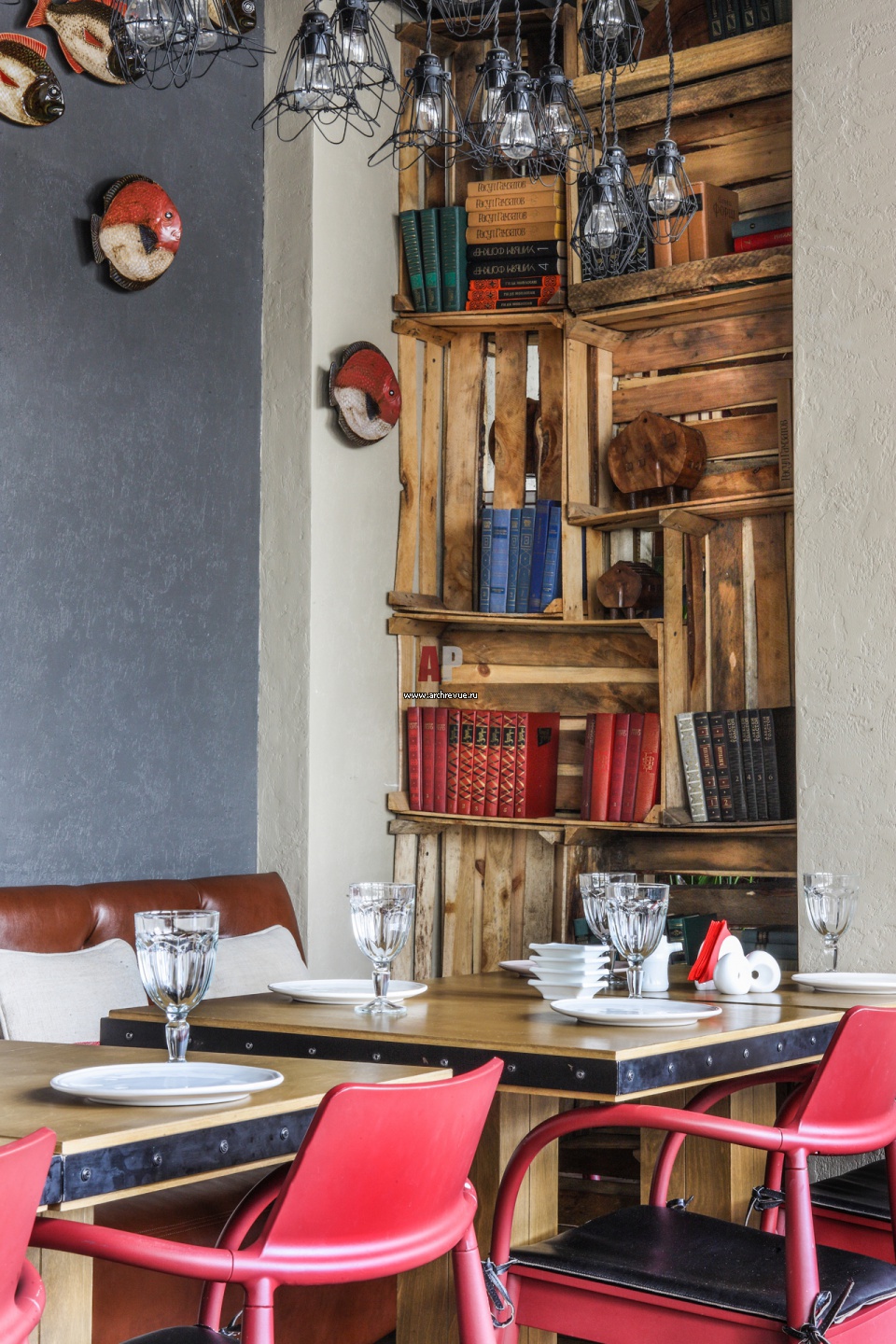 В узких нишах между колоннами дизайнеры сделали импровизированную библиотеку. Книжные стеллажи выполнены из грубо сбитых ящиков разной высоты и ширины.