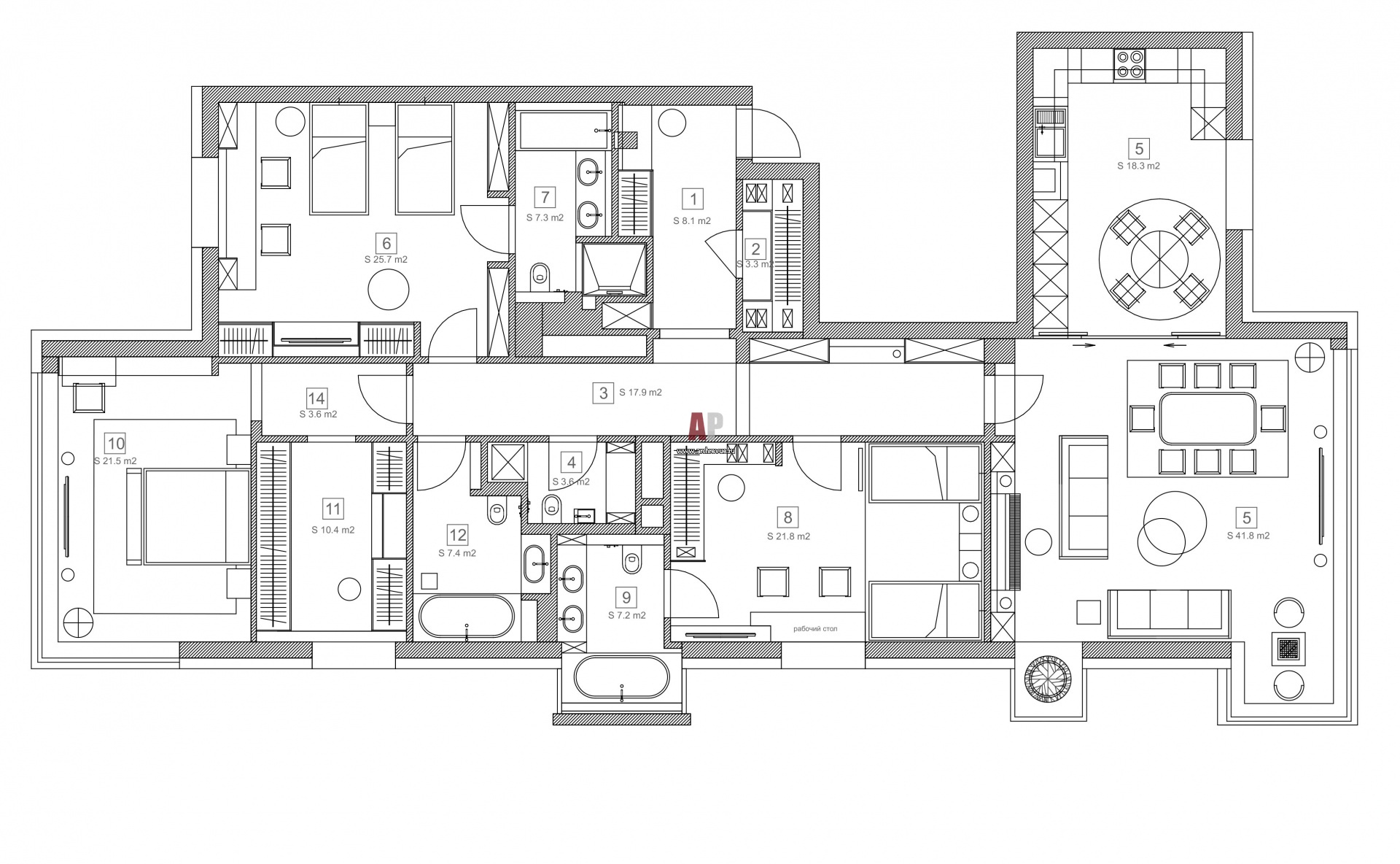 Планировка квартиры для большой семьи. Общая площадь 200 кв. м.