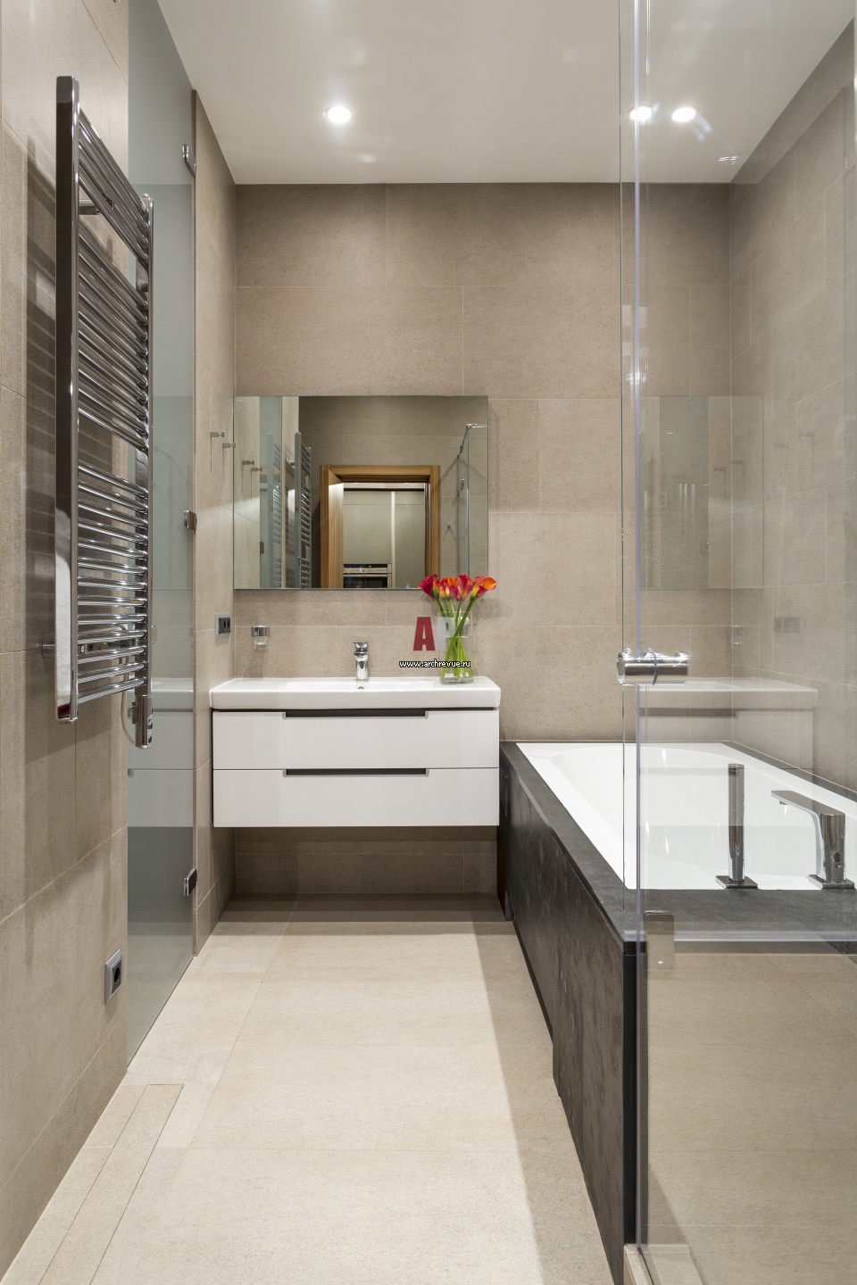 Ванная комната в современном стиле отделана керамогранитом. Ванна, Villeroy & Boch, модель Oberon. Раковина, Villeroy & Boch, серия Subway. Смесители, Dornbracht.