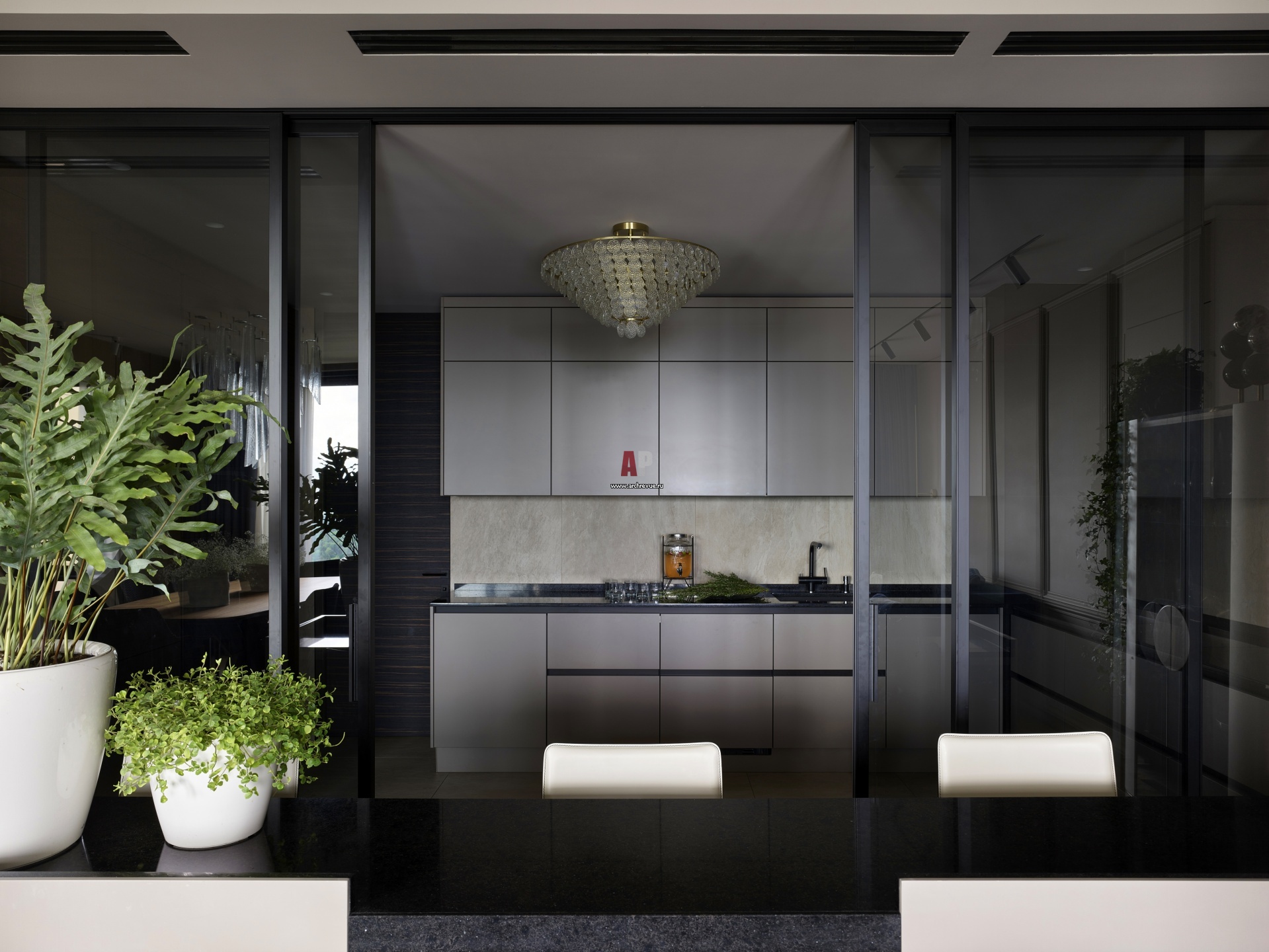 Кухня Nolte выполнена в строгом, минималистском стиле. Шкафы с закрытыми фасадами, без ручек. Люстра, Maytoni.