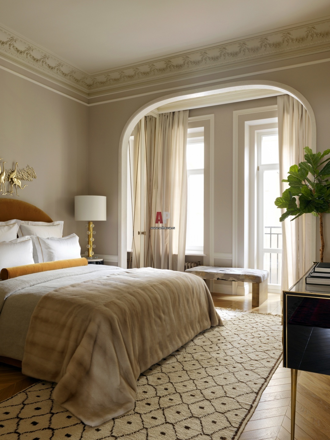 Интерьер спальни. Арочный проем между комнатой и балконом вызывает воспоминания о классических парижских квартирах. Кровать, прикроватные тумбы, банкетка сделаны на заказ по дизайну Лейлы Улуханли.