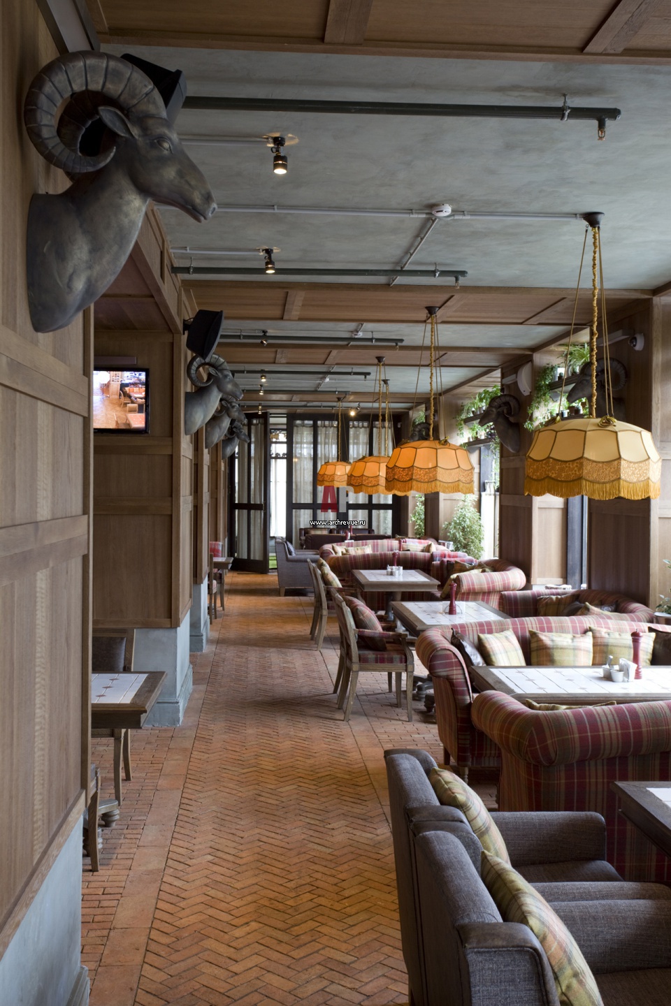На полу ресторана – антикварный паркет с состаренной поверхностью. Диваны в обивке в красную клетку, NEXXT.