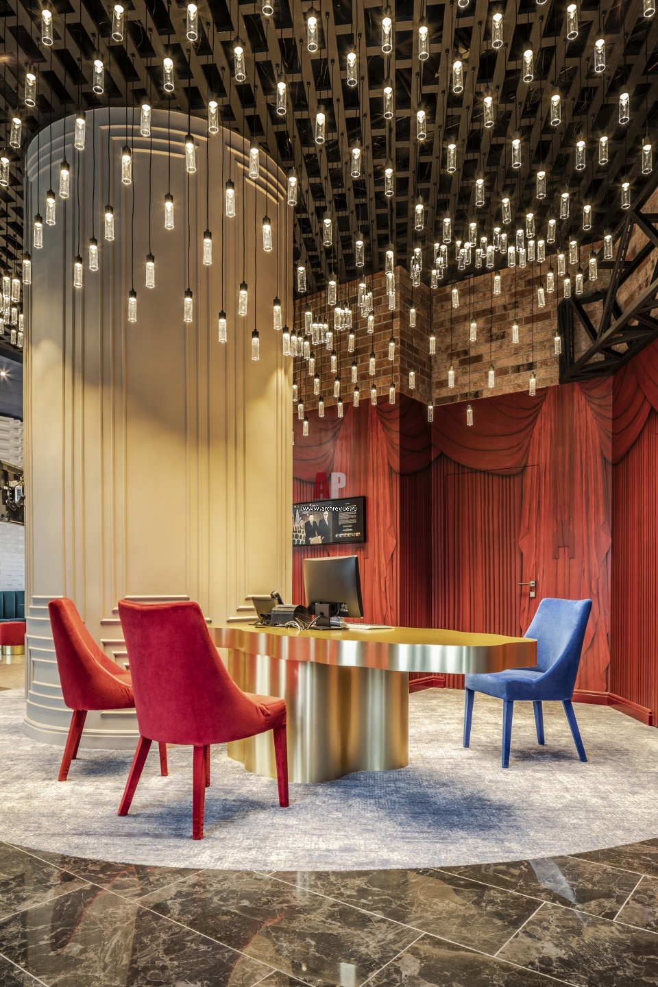 Оригинально решена зона рецепции: вместо традиционной стойки для приема гостей авторы проекта разработали автономные столы разной высоты с удобными креслами. Золотые столы обтекаемых форм сделаны на заказ.