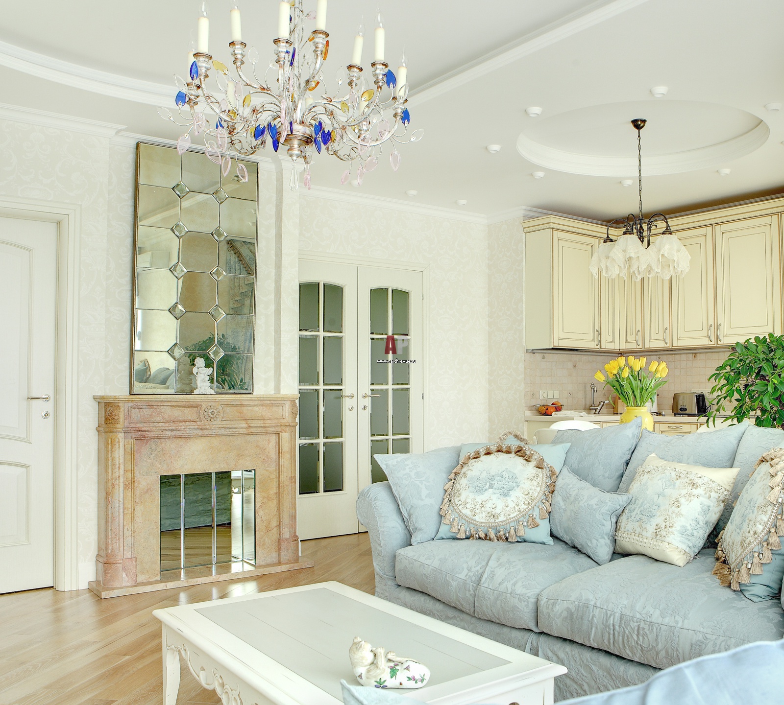 Интерьер гостиной декорирован фальш-камином. Его портал сделан из резного мрамора, поставщик новый«Новый камень». Со стеклянными полотнами распашных дверей Union рифмуется вертикальное зеркало, набранное из небольших квадратов.