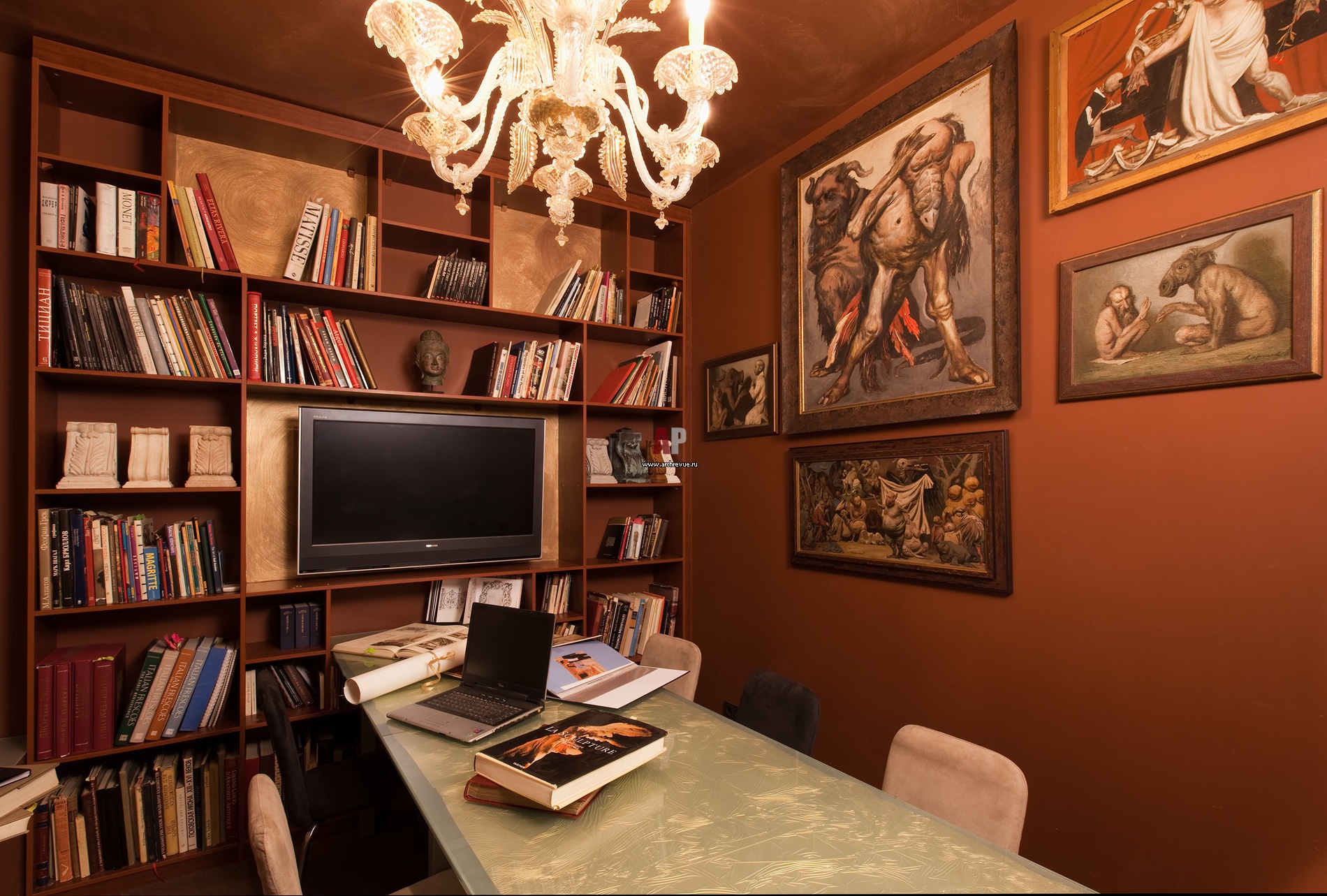 Стол со стеклянной столешницей в кабинете руководителя – авторский предмет, сделанный на заказ. Стекло выполнено в сложной технике.