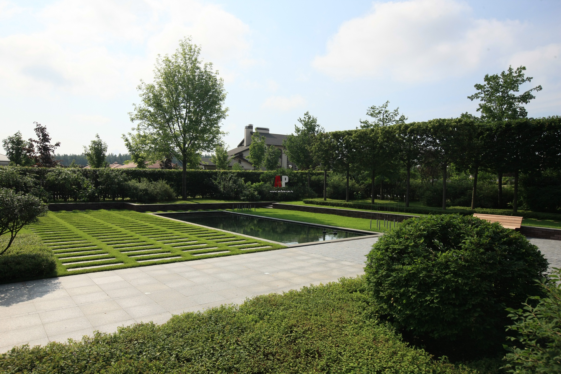 Фото ландшафта. Центром ландшафтной композиции является эффектный водоем прямоугольной формы.
