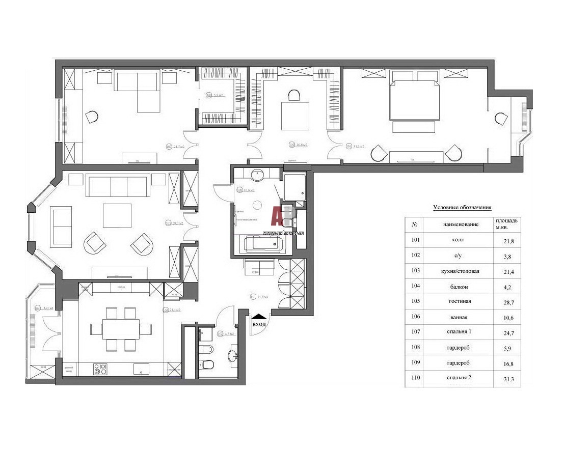 План 3-х комнатной квартиры в стиле неоклассика на Кутузовском проспекте.