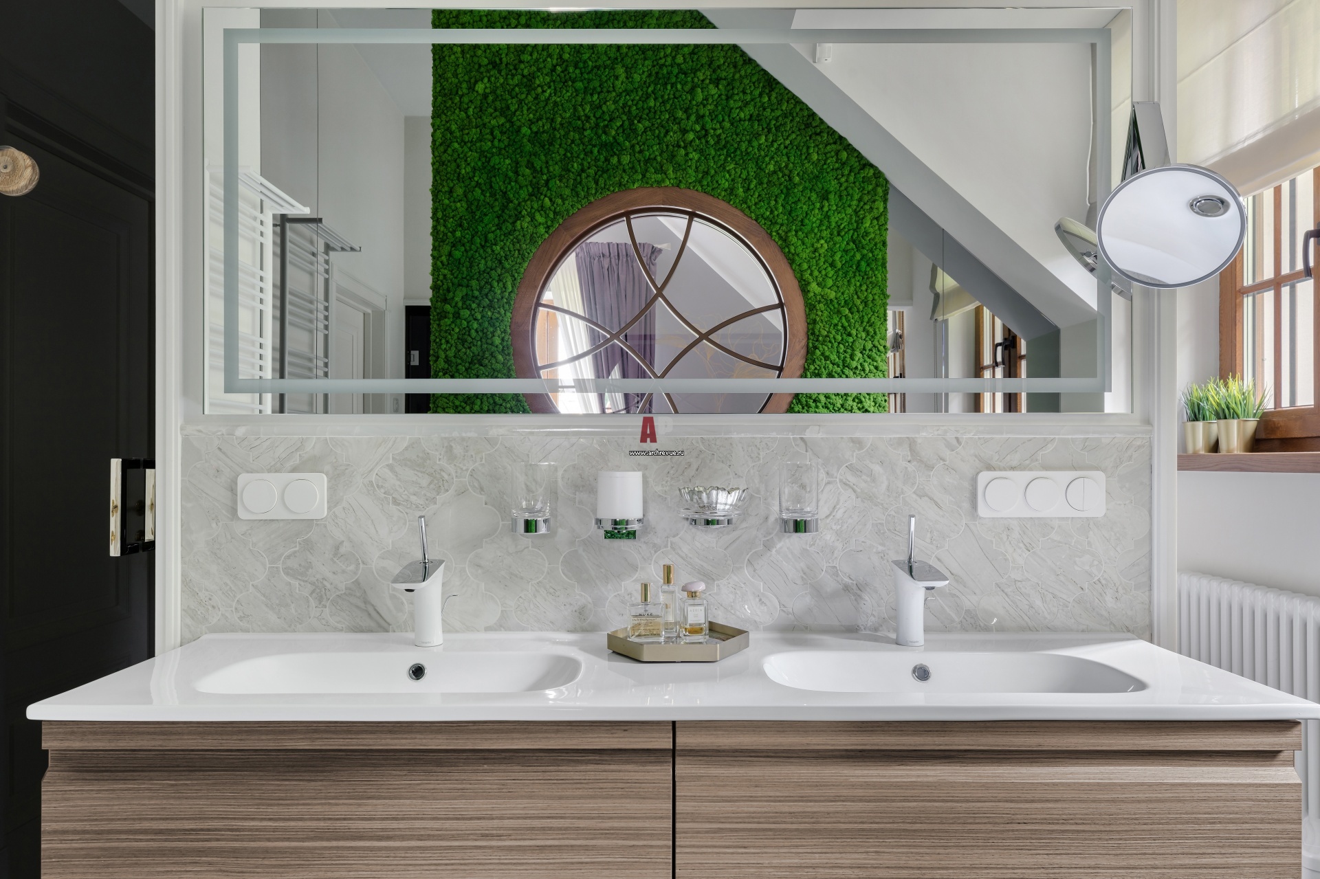 Интерьер хозяйской ванной комнаты. В зеркале над умывальником отражается стена из стабилизированного мха.
