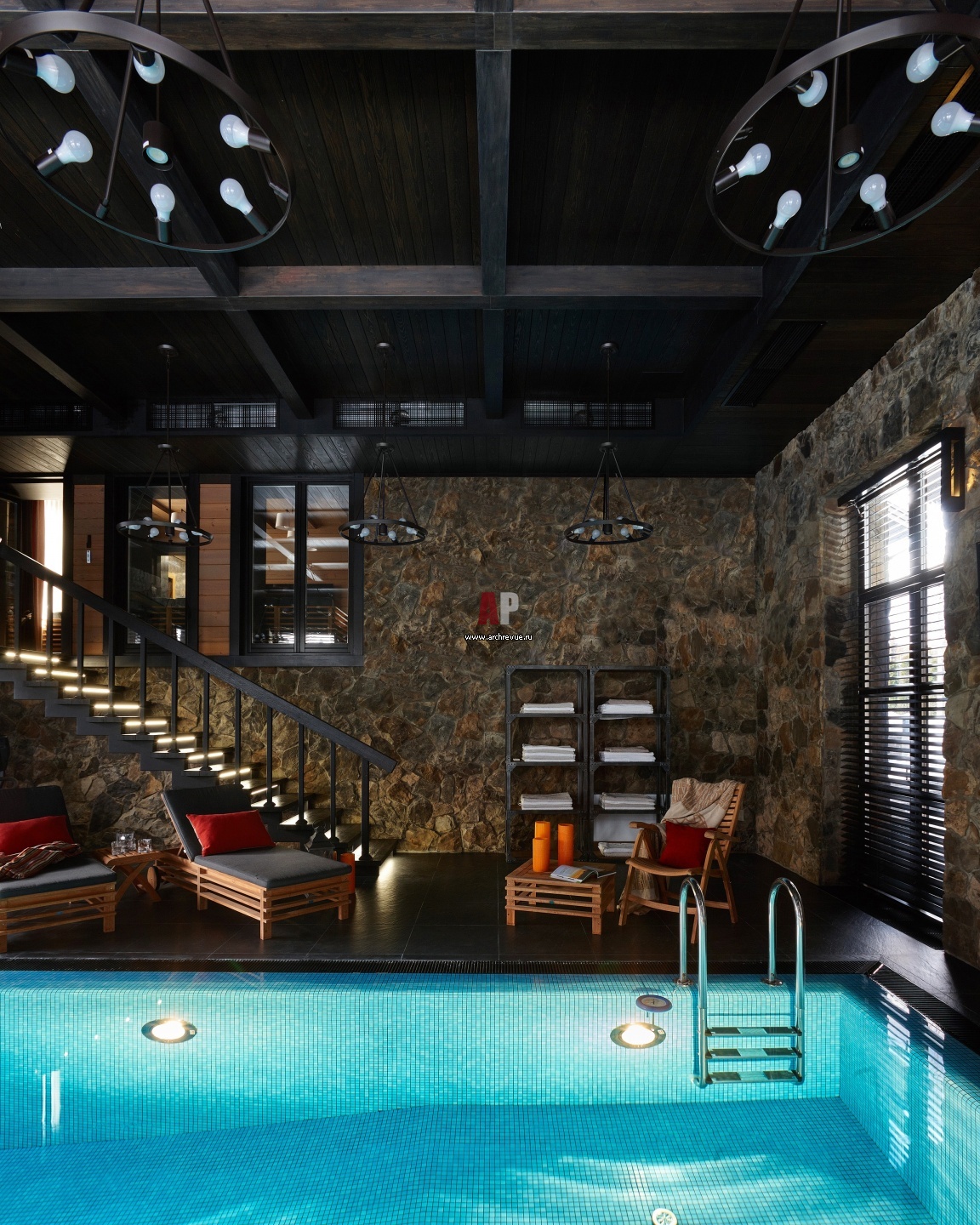 Стены в бассейны облицованы песчаником, такой же камень использован в отделке фасада. Потолок подшит термодеревом. Светильники, Visual Comfort & Co.