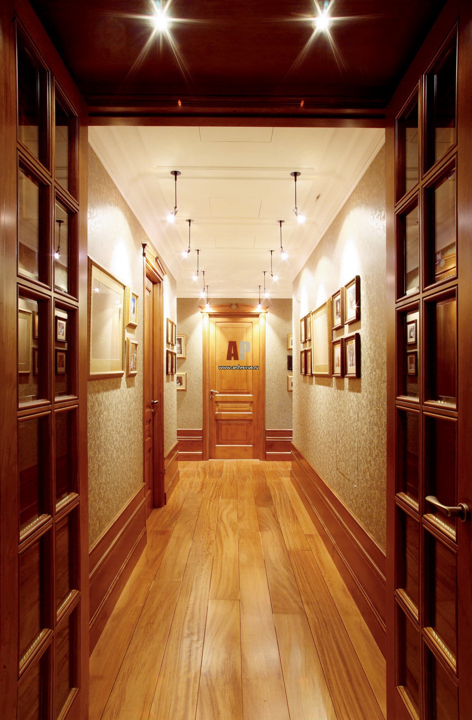 Коридор, который ведет к спальням, обыгран как галерея. Высокие плинтусы выполнены из дерева в английской традиции. Обои, Sanderson.