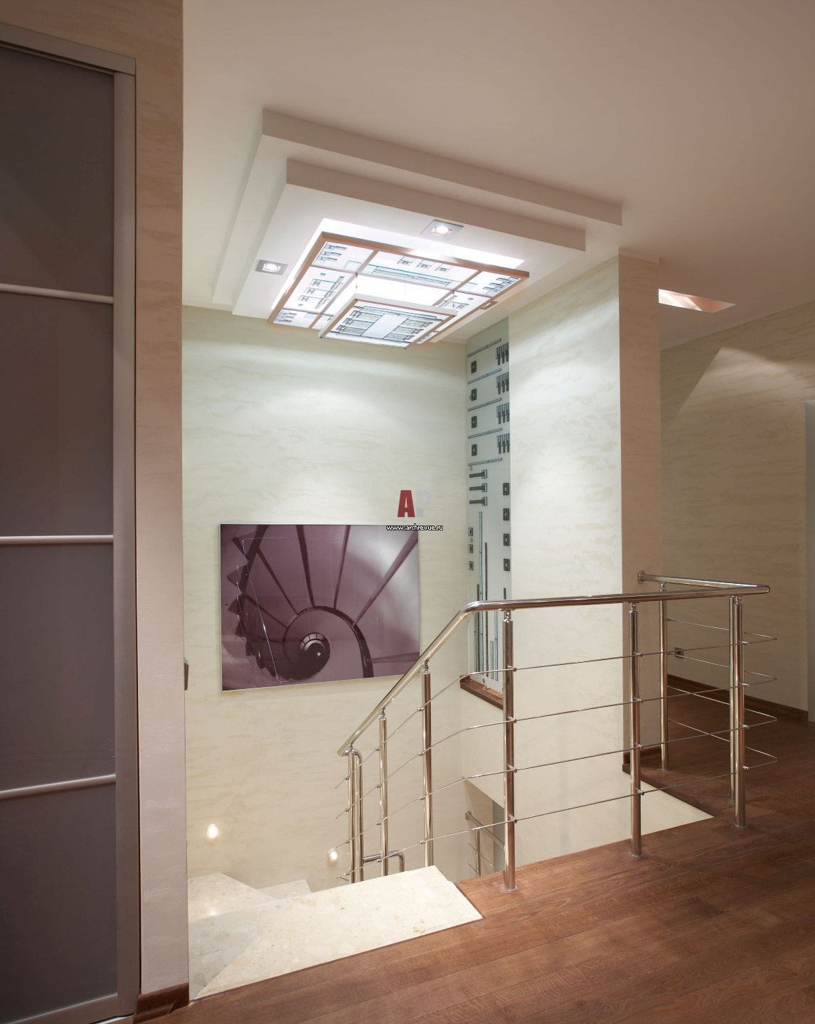 Светильник над лестницей – элемент единого витражного оформления интерьера. Витражи художник Борис Тумов, компания «Том Глас»