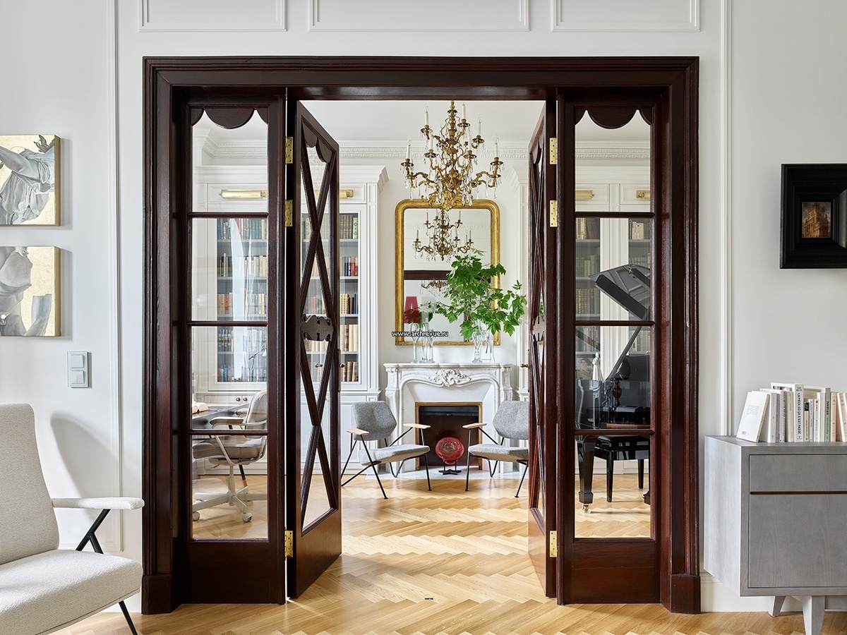 Гостиную от музыкального салона с камином отделяют исторические двери, которые были тщательно отреставрированы. Петли оставлены старые, ручки – современные, Venezia.