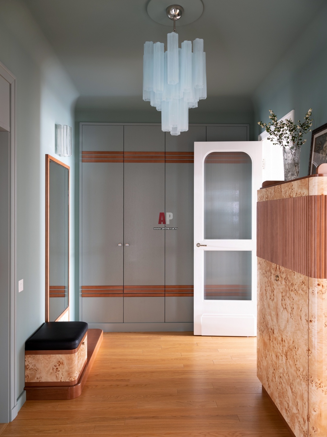Прихожая. Встроенные шкафы, двери, обувница, зеркало, тумба изготовлены по эскизам дизайнеров. Бра, Италия, 1980-е гг.