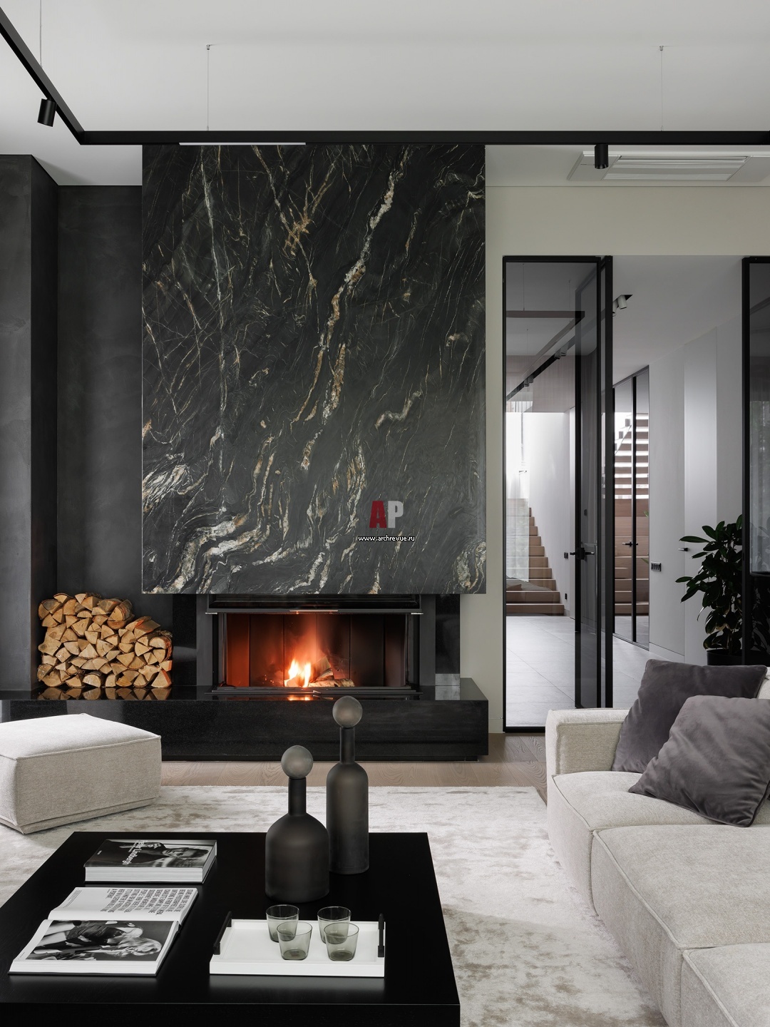 Доминанта первого этажа – панорамный, трехсторонний камин, отделанный слэбом натурального черного камня с прозрачными прожилками, который привезли из Бразилии. За счет топки с прозрачным стеклом, монументальная композиция слово парит в воздухе.