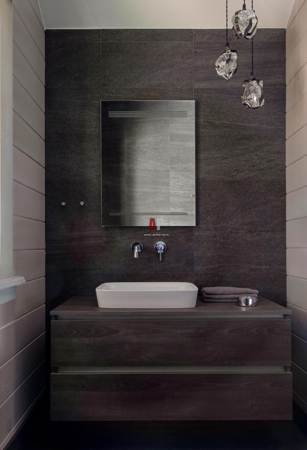 Гостевой санузел. Почти все стены оставлены деревянными, кроме стены за умывальником. Она облицована темным камнем. Мебель из темного дерева сделана на заказ.