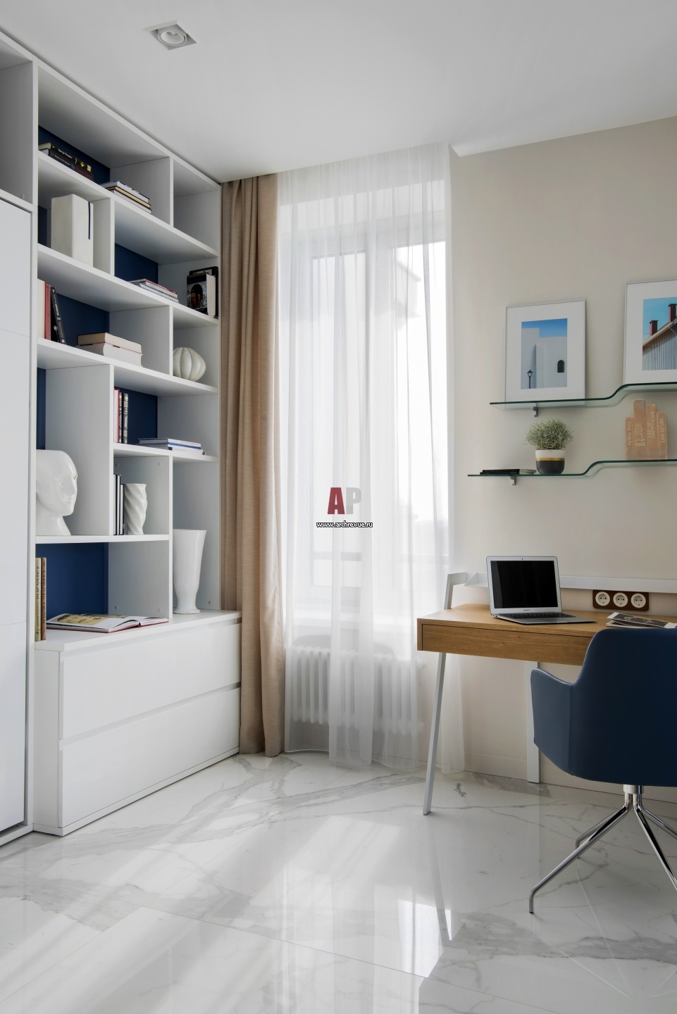 Зона кабинета. Стеллаж для книг сделан по эскизам дизайнеров, в нем прячется откидная кровать и мини-комод на случай, если одновременно приедет много гостей. Рабочий стол, кресло, стеклянные полки, Bontempi.