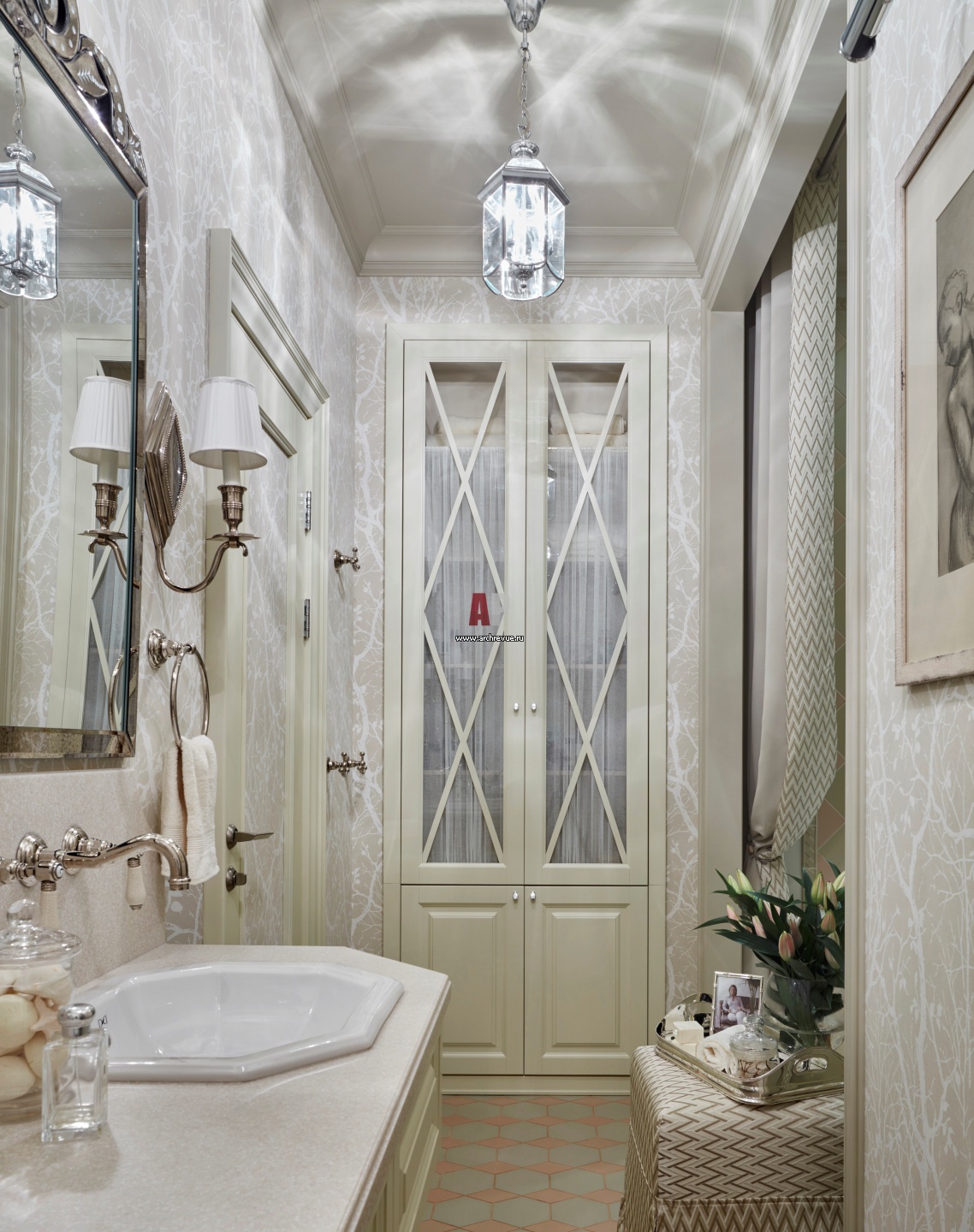 Встроенный шкаф в ванной выполнен по индивидуальным чертежам. Обои, Thibaut. Раковины, Devon & Devon. На полу – керамическая плитка, Etruria Design.