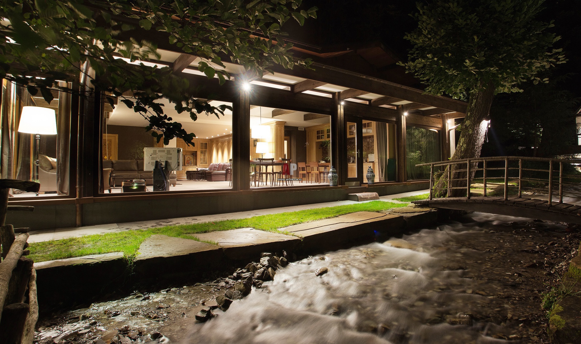 Фасад дом протянулся вдоль бурного горного ручья, бегущего через весь участок. Через стеклянные стены из всех основных помещений открывается вид на природную стихию.