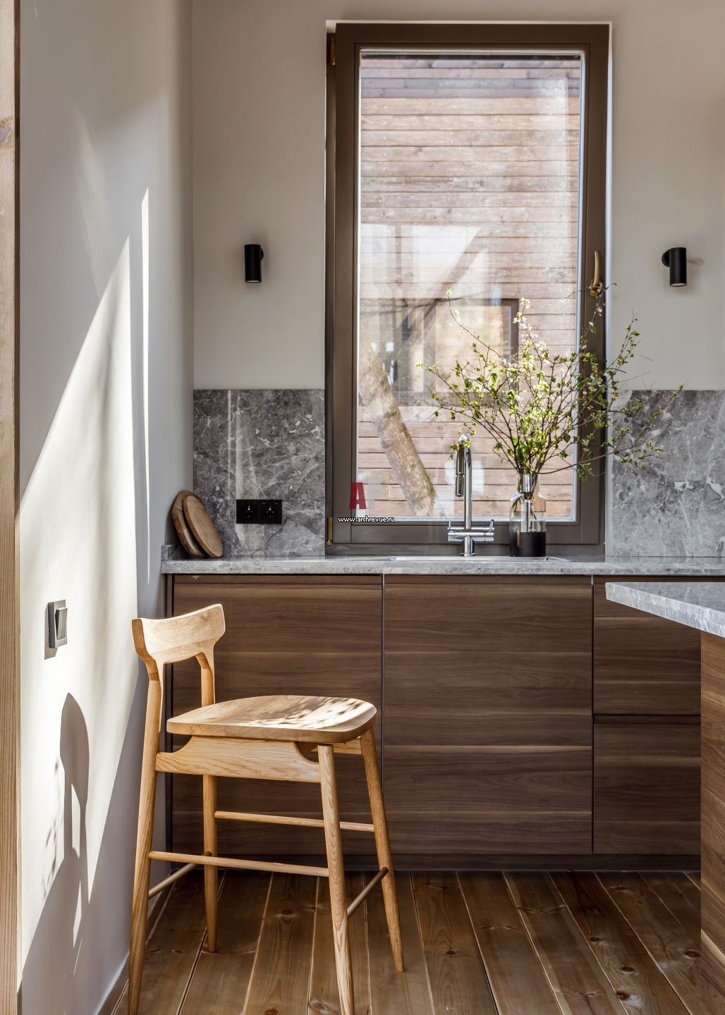 Небольшой дом для семейного отдыха в Сочи. Интерьер кухни. Стены окрашены моющейся краской бежево-серого цвета, Tikkurila.