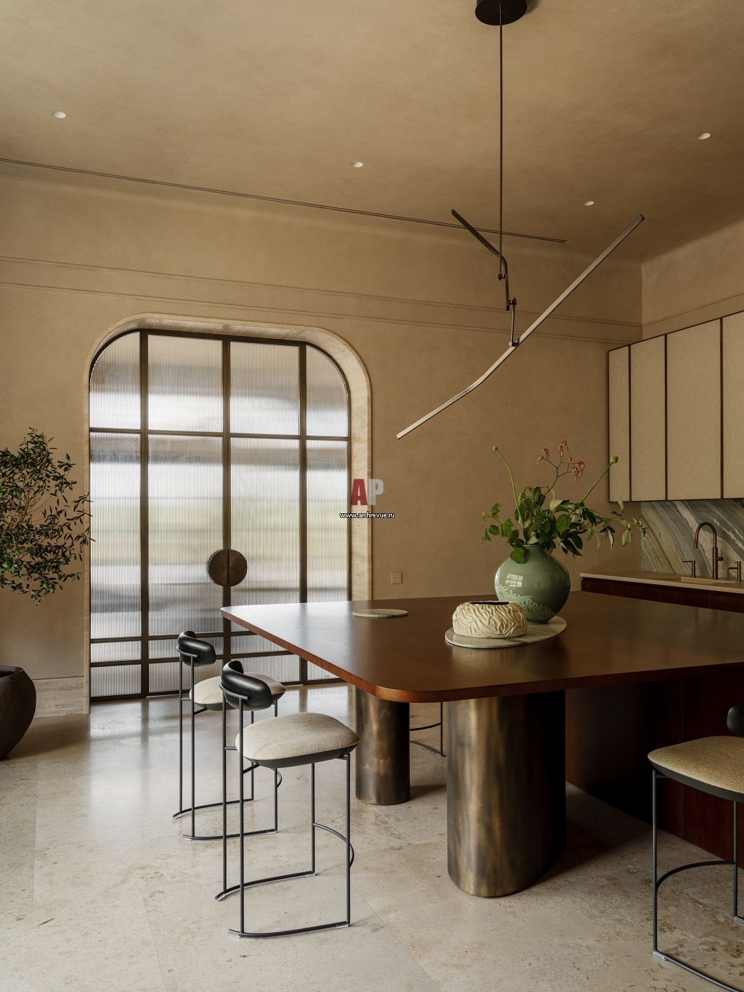 Из столовой через художественные стеклянные двери попадаешь на кухню. Стены во всех основных помещениях оформлены декоративная покраска в одном оттенке в песочном оттенке, который объединяет весь интерьер.