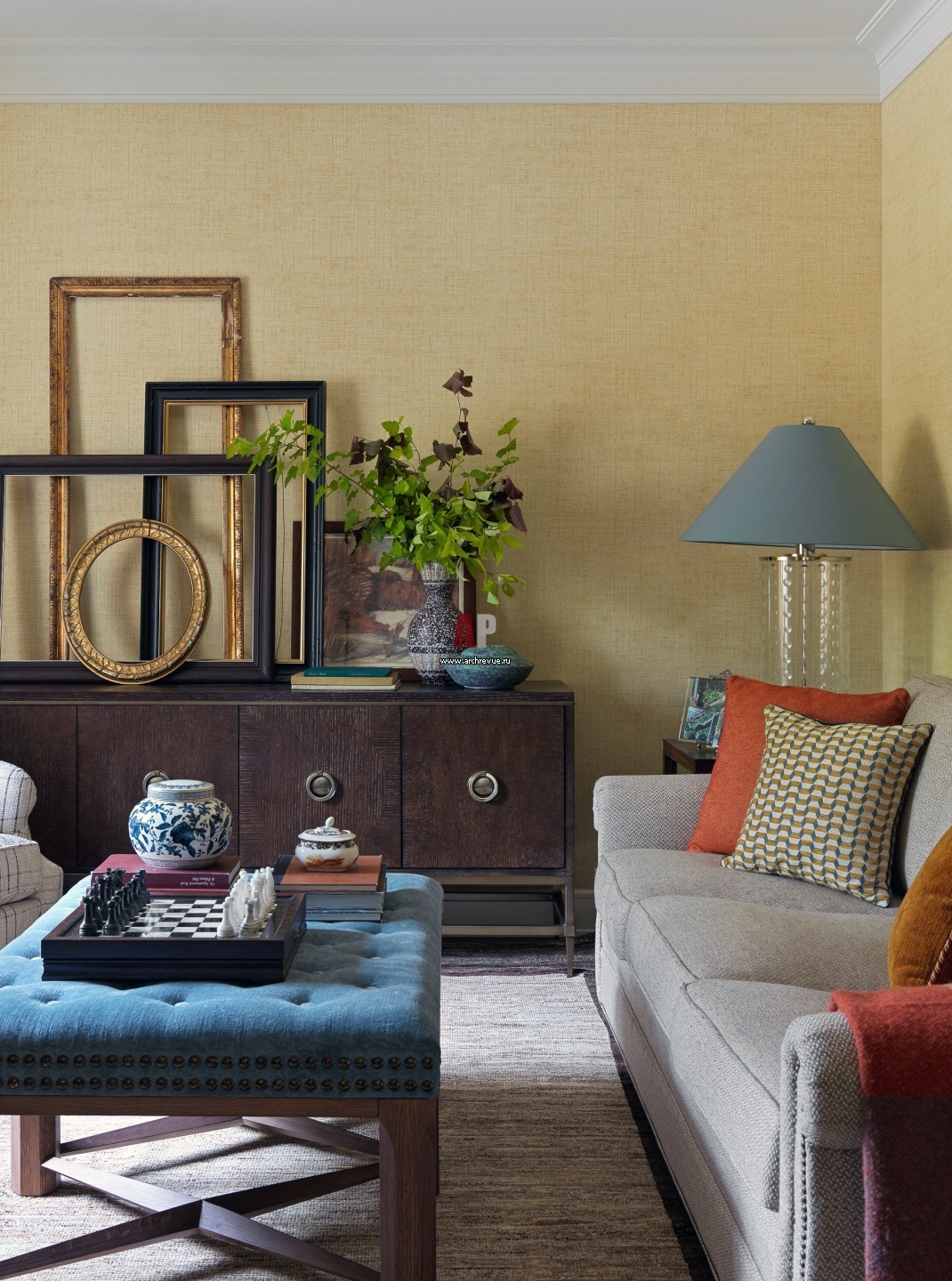 Дом в американском стиле с теплой палитрой. Интерьер гостиной.