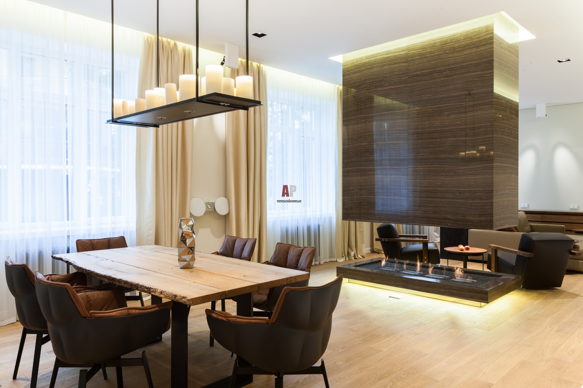 Гостиная визуально разделена на две части с помощью биокамина. Обеденный стол, Riva 1920. Стулья, B&B Italia.