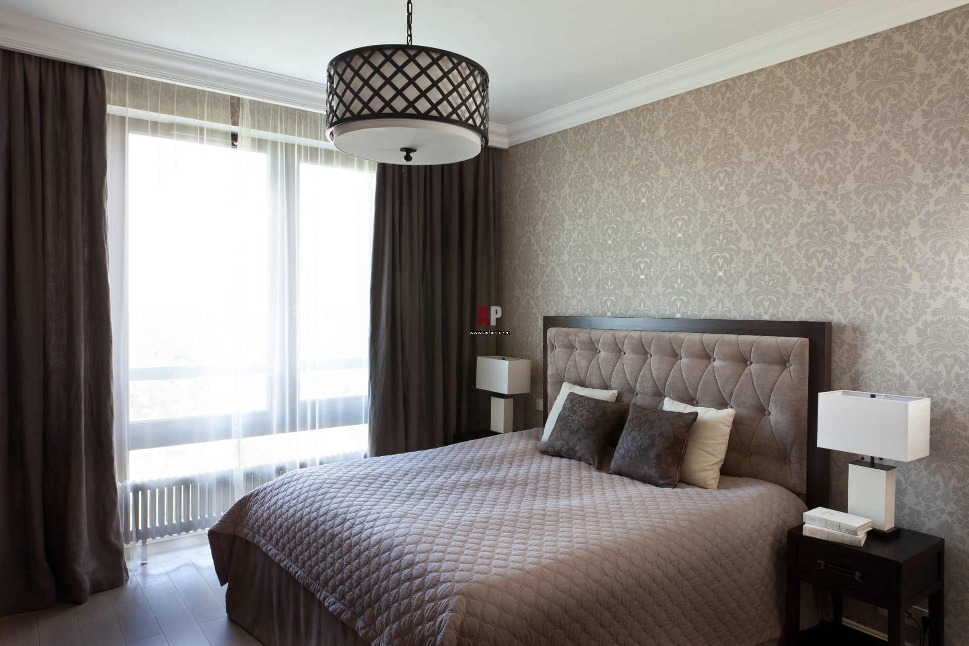Интерьер спальни выполнен в теплых, коричнево-бежевых тонах. Кровать, Hastens. Тумбы, комод, L'Origine. Обои Ralph Lauren, поставщик «Ампир Декор». Лепные карнизы, Orac Decor, поставщик «Ампир Декор».