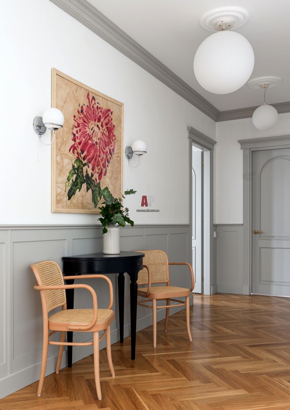 Нижняя часть стен, двери и карниз в прихожей выкрашены в серый цвет. Остальные стены – белые. Над консолью репродукция рисунка Эгона Шиле.