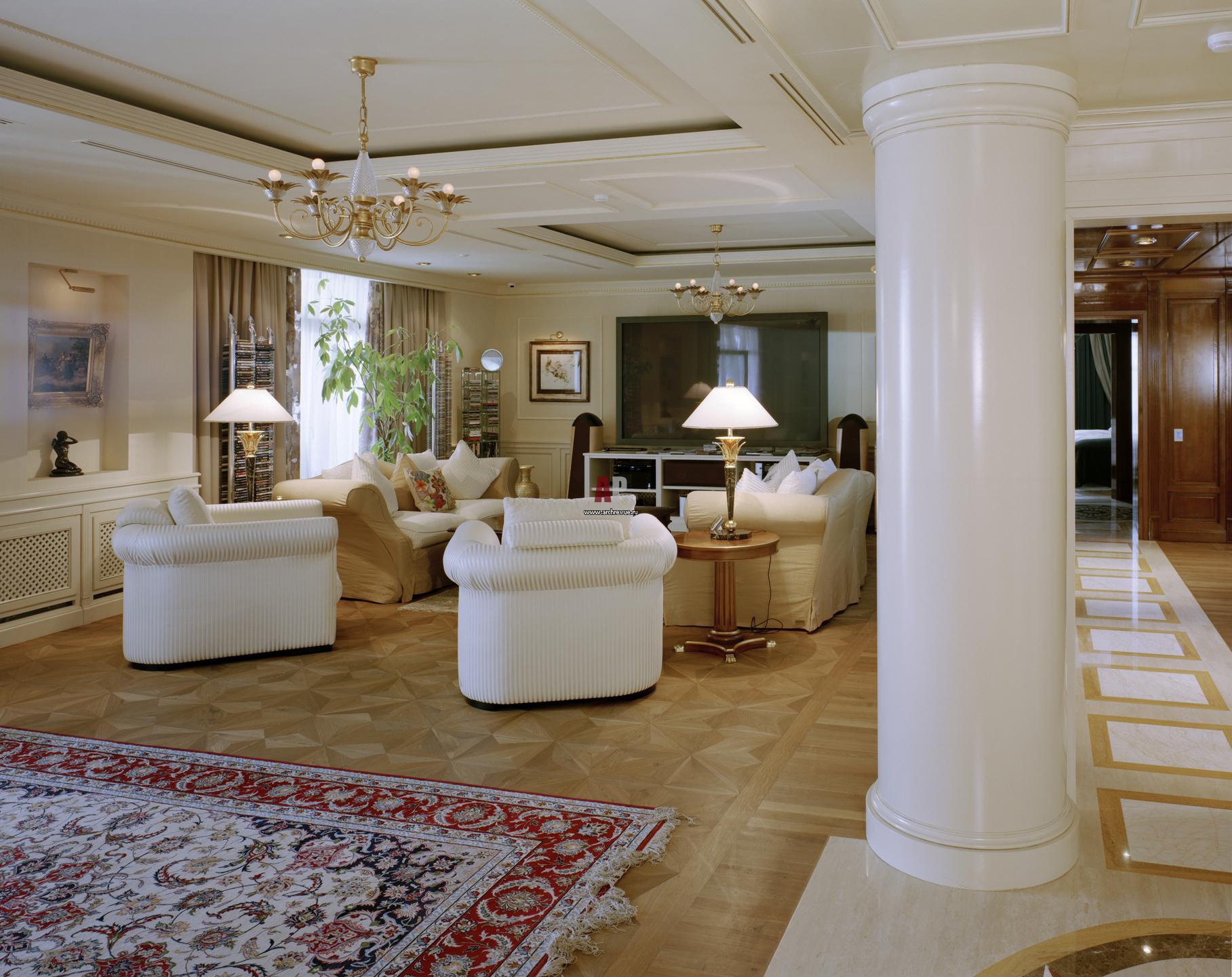 Интерьер гостиной выдержан в традиционной классической стилистике. Одной из задач проекта стало размещение в пространстве произведений искусства из коллекции заказчика. В зоне гостиной автор проектирует ниши, где представлена живопись и скульптурные работы. Мебель, поставщик Grande Arredo, диваны Fendi, на полу паркет, поставщик Mogentale.