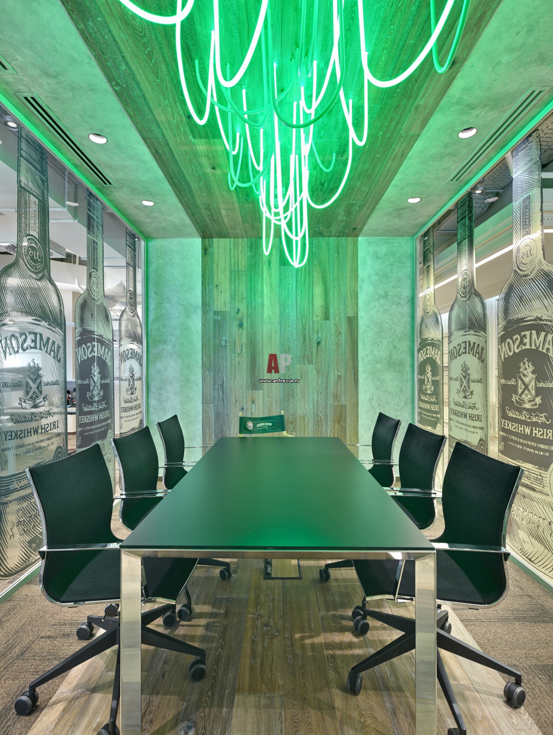 Интерьер «ирландской» переговорной на рабочем этаже офиса. Стены, стекло, принт.