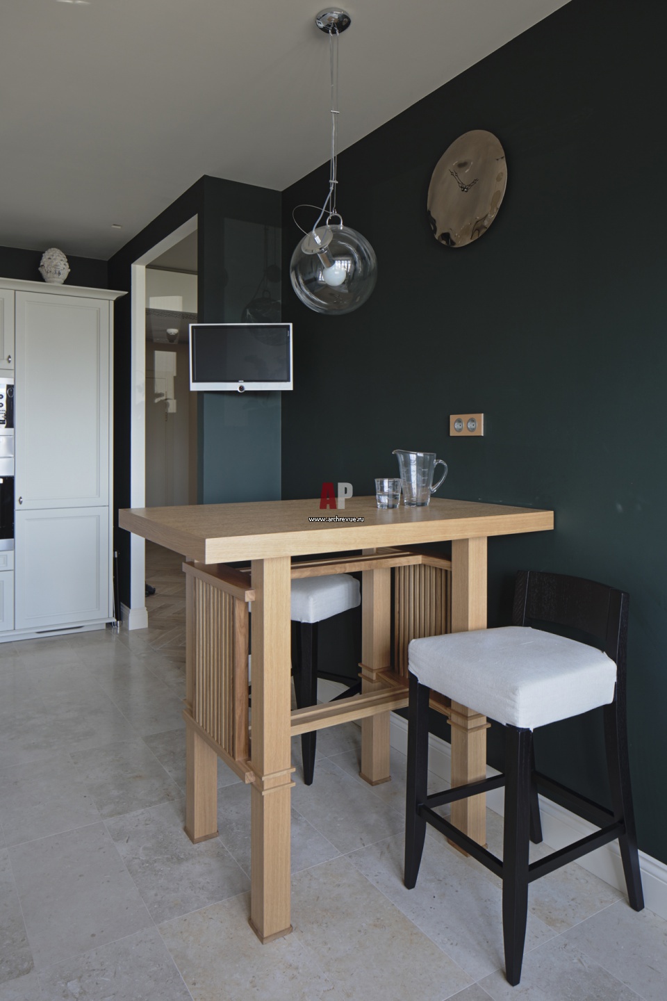 Зона для завтраков на кухне. Компактный стол на высоких ножках выполнен на заказ, он не занимает много места и удобен в эксплуатации.