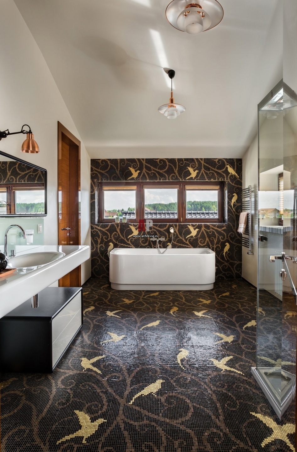 Хозяйская ванная комната на втором этаже разделена на два блока: зону ванны, умывальника и душа, а также отдельную туалетную зону. Пол выстлан роскошной смальтовой мозаикой с рисунком в виде птиц. Сантехника, Duravit.