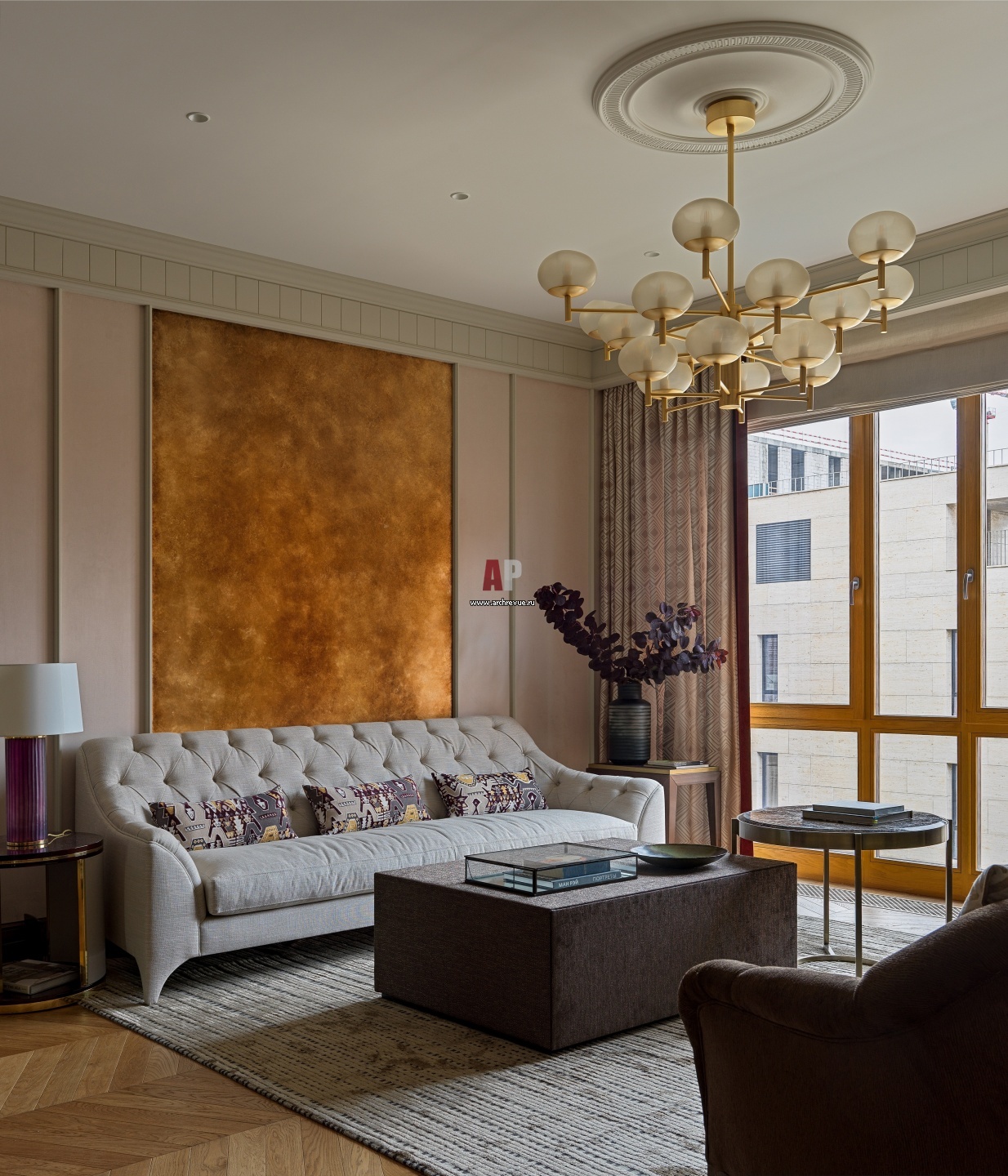 Зона отдыха в гостиной. Диван Selva сразу полюбился хозяйке за изящные формы и удобство. Золотое панно за диваном наполняет интерьер теплым свечением.
