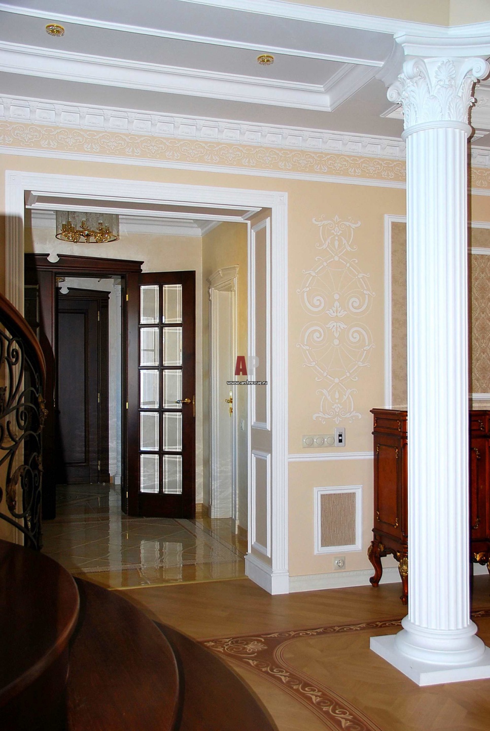 На фото – дизайн гостиной с анфиладой дверей. Бежевые стены украшены белой трафаретной росписью. Классические колонны из гипса.