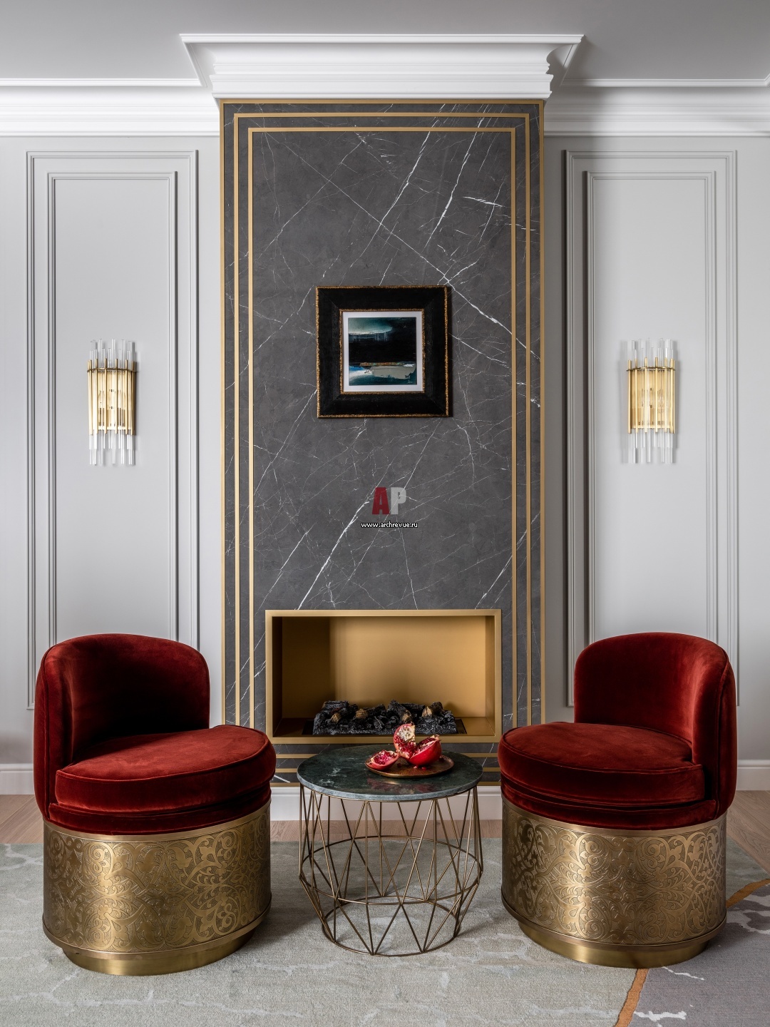Камин. Портал камина выполнен из камня, топка – латунная. Над камином – картина Кристиана Эвана. Бра, Hudson Valley Lighting, модель Theory Corbett.