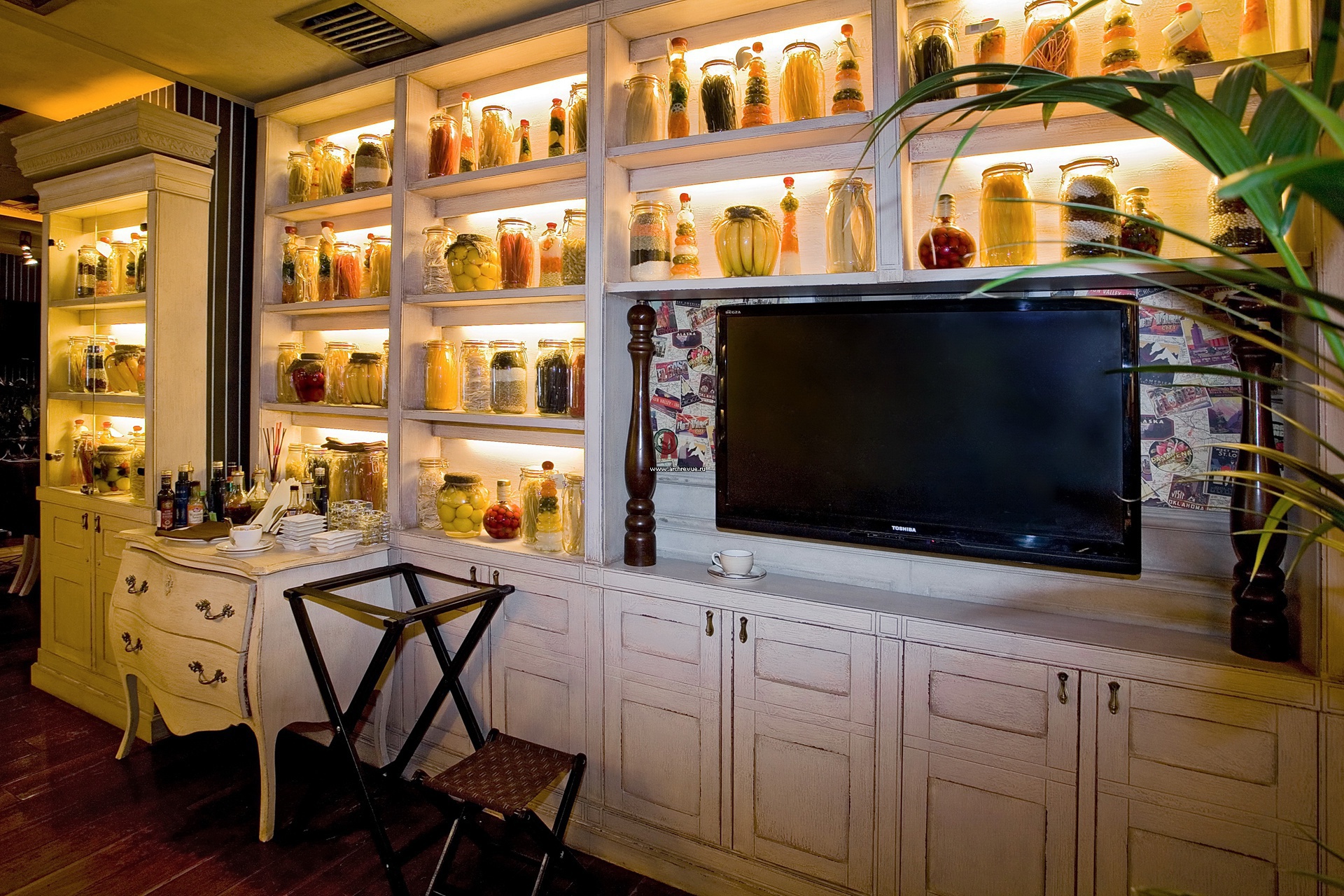 Интерьер итальянского ресторана. На полках стеллажа из выбеленного дуба выставлены банки с консервированными овощами, которые добавляют национального колорита.