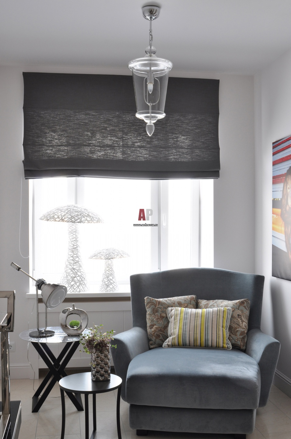 Зона отдыха у окна. Римские шторы из льна сложного серого цвета.