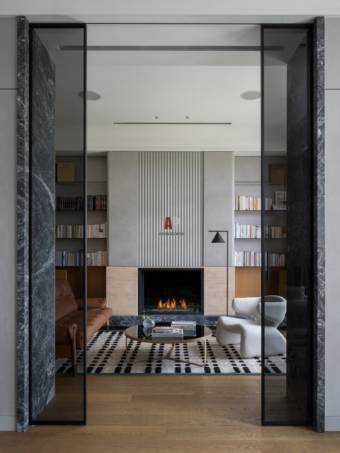За раздвижными стеклянными перегородками расположен небольшой кабинет с балконом и красивым видом на город. Раздвижные двери уезжают внутрь стены, торцы которой отделаны натуральным мрамором. Благодаря этой облицовке создан эффект толстой стены-обманки.