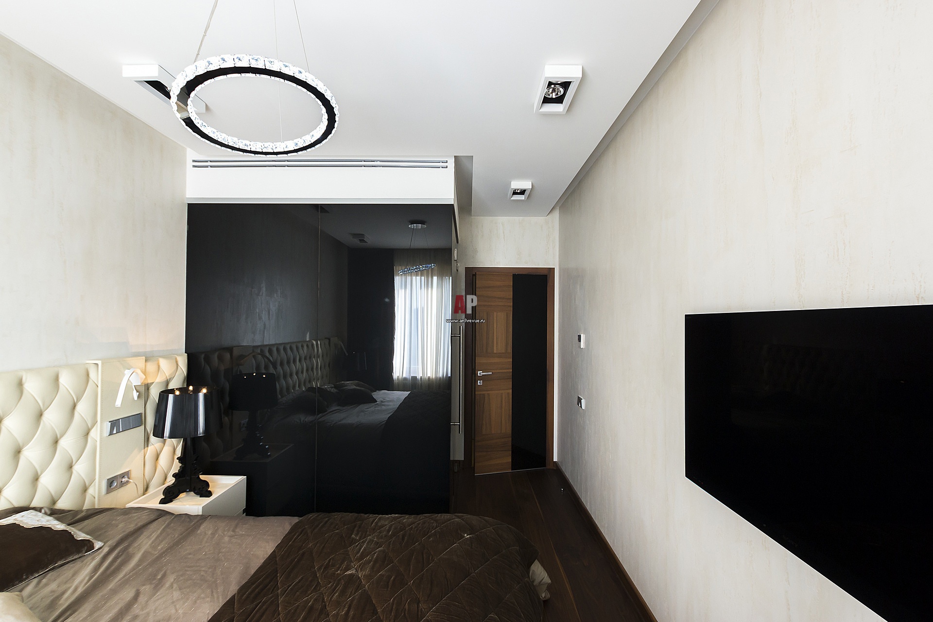 Интерьер хозяйской спальни выдержан в контрастной черно-белой гамме. В черном глянцевом кубе размещена гардеробная.