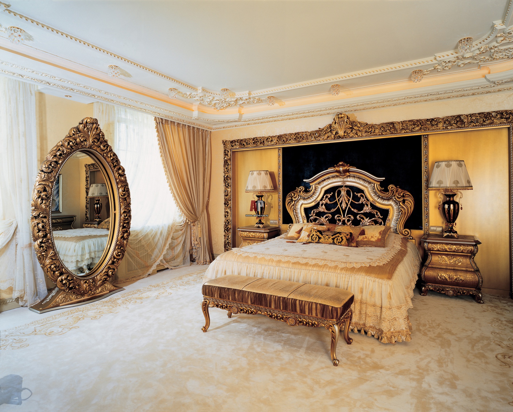 Интерьер спальни наполнен золотым свечением. Овальное зеркало в пышной резной раме видно от входа.