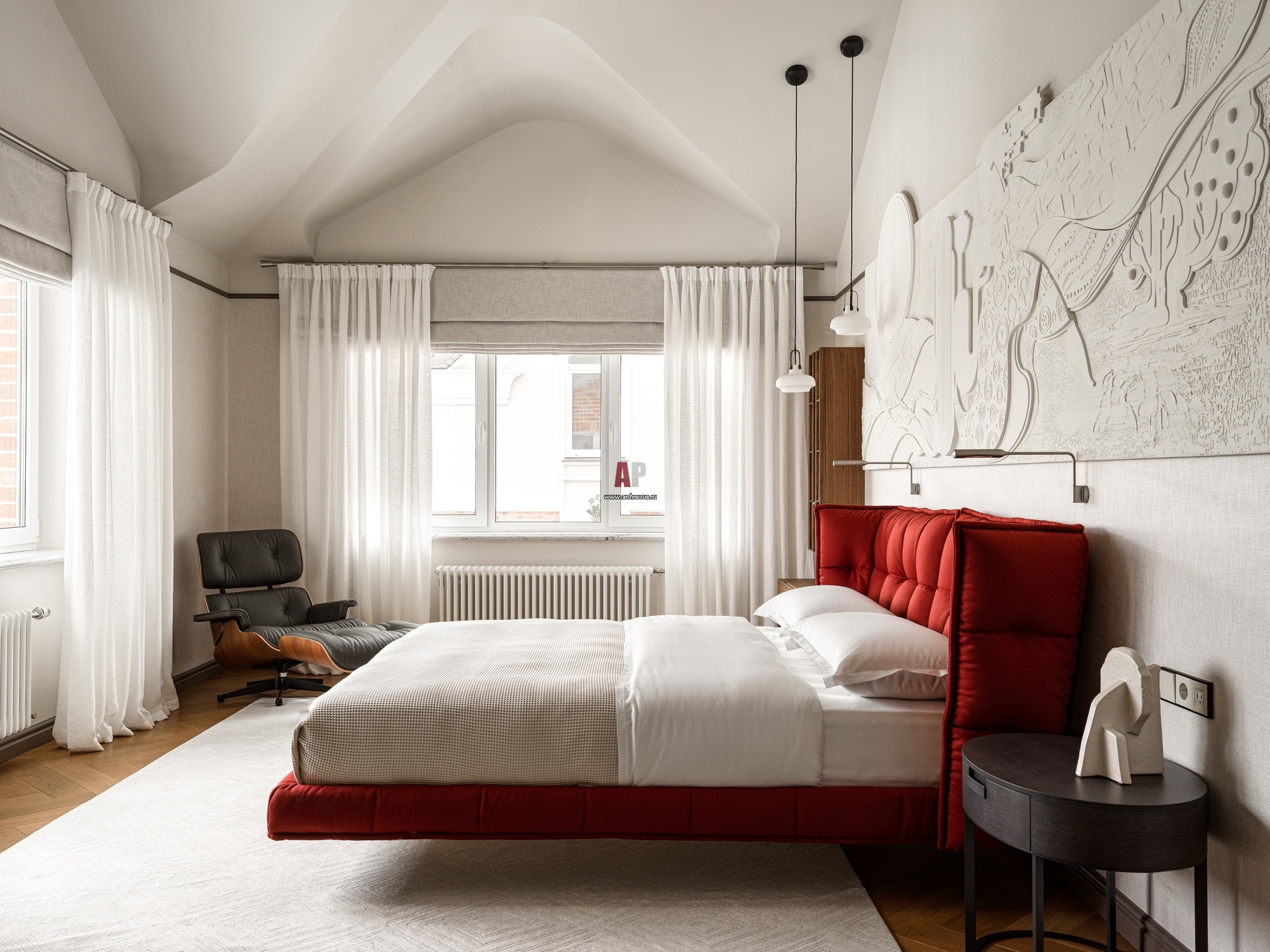Мастер-спальня. Стена за изголовьем кровати украшена рельефным панно ручной работы скульпторов Лолы Метелкиной и Игоря Кабишева. Кровать с акцентной красной отделкой, B&B Italia. Шезлонг, Vitra. Шторы и обои, Pierre Frey, Casamance.