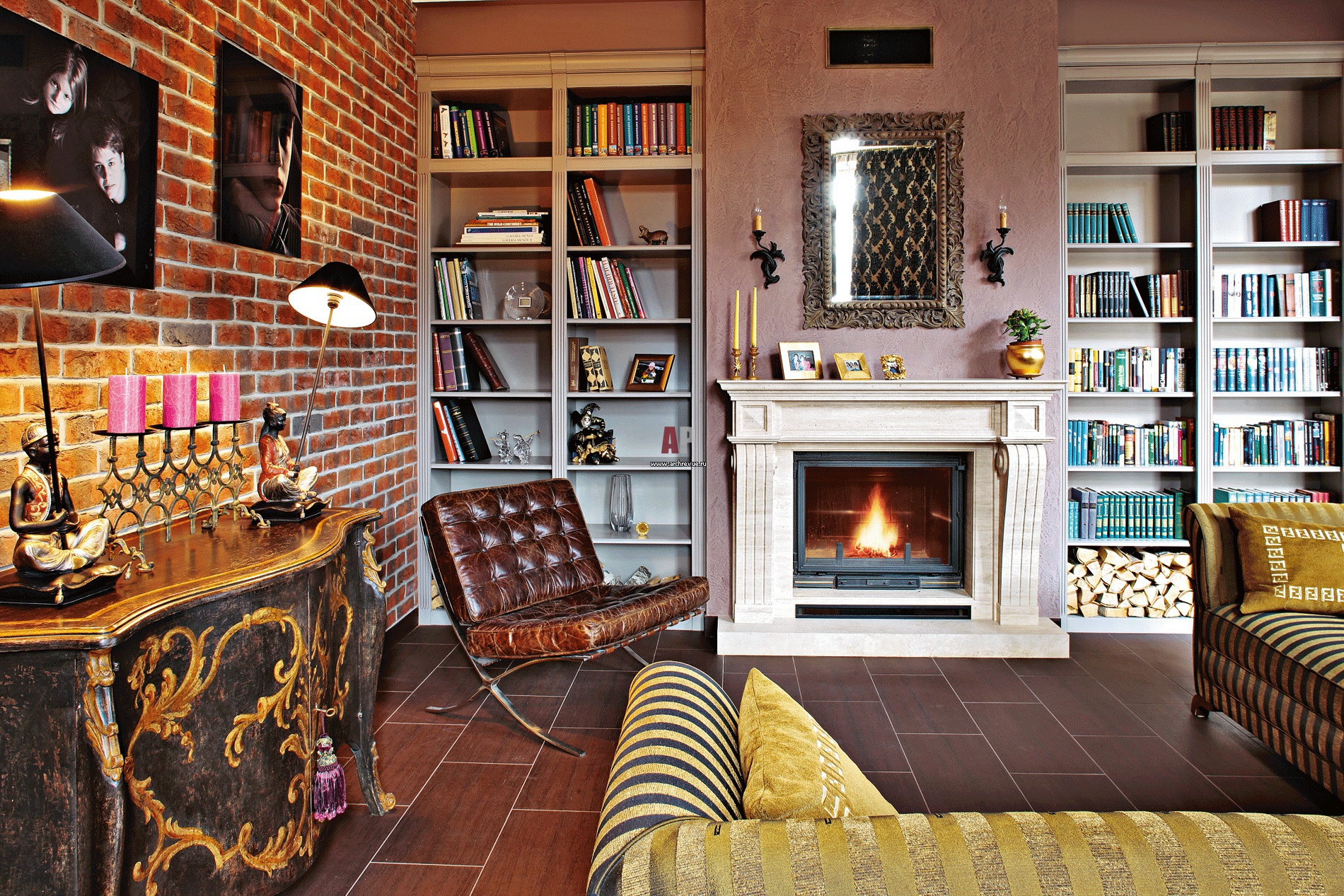 Фото интерьера каминной загородного дома в стиле фьюжн