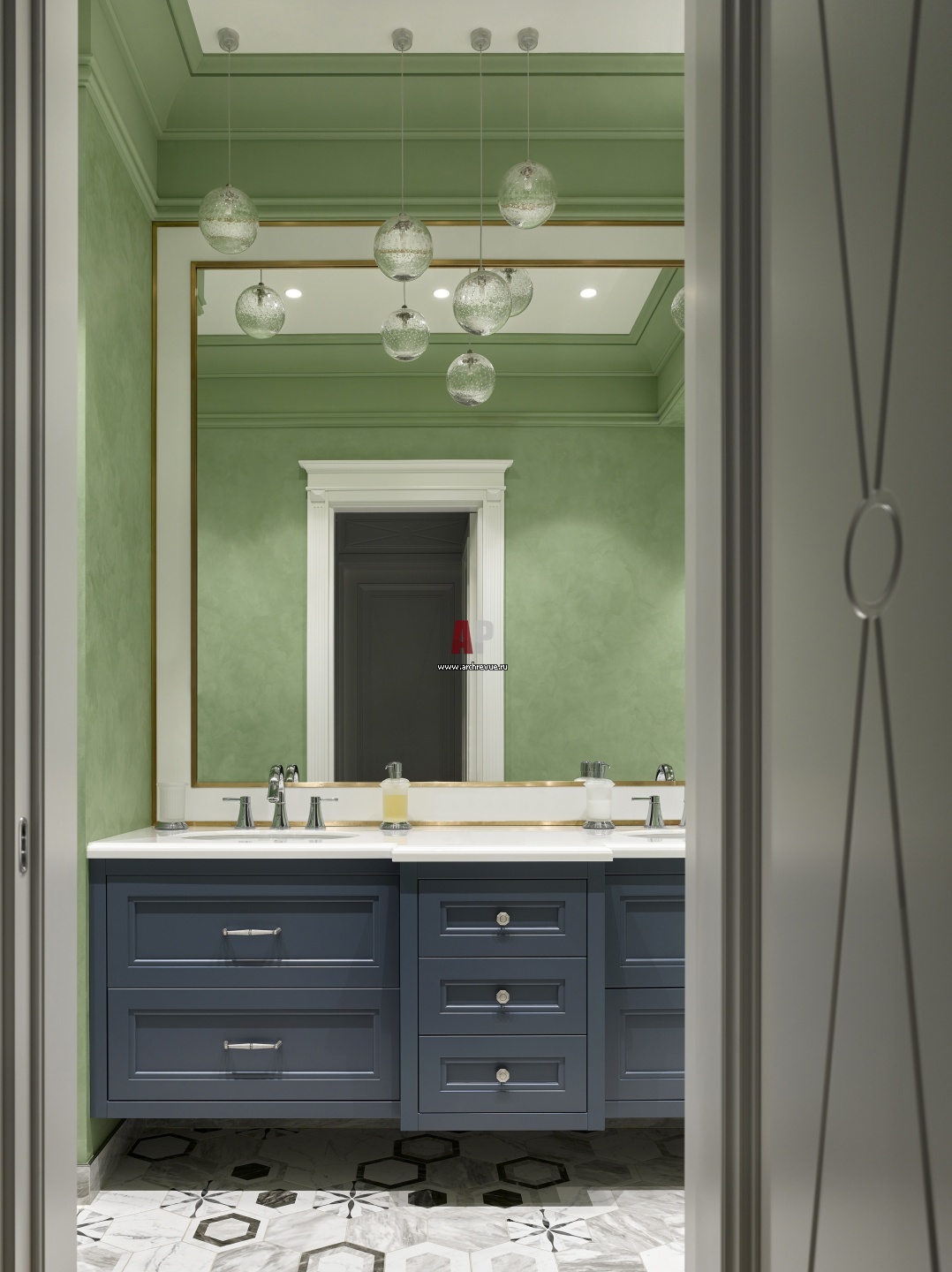 В детском санузле присутствуют яркие цветовые акценты. Умывальник с двумя раковинами сделан на заказ. Зеркало во всю стену увеличивает пространство.