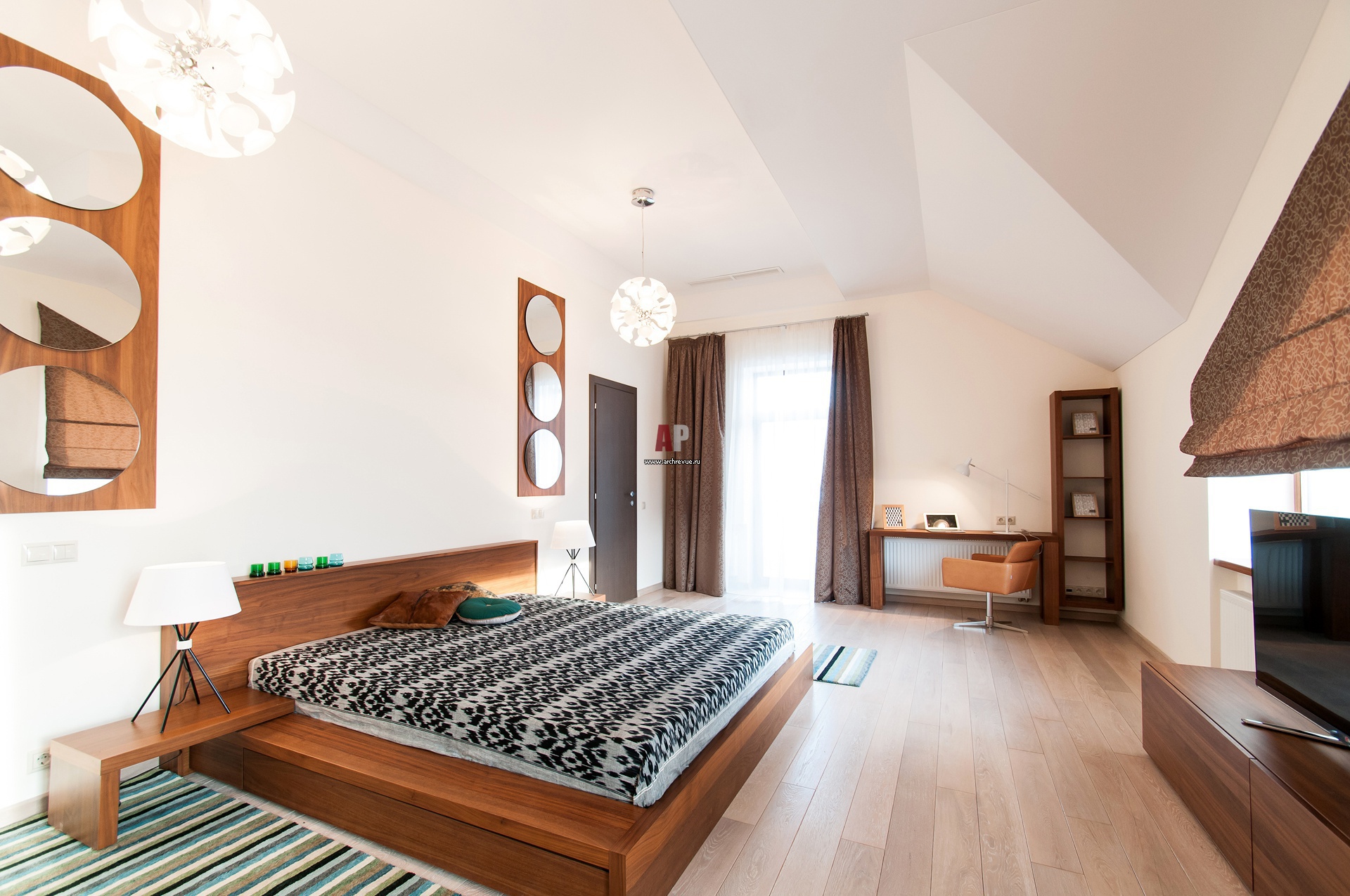 Дизайн детской комнаты в современном загородном доме. Уютную атмосферу в светлом помещении создает мебель из шпона ореха. Круглые зеркала в деревянной раме выглядят как панно в стиле поп-арт.