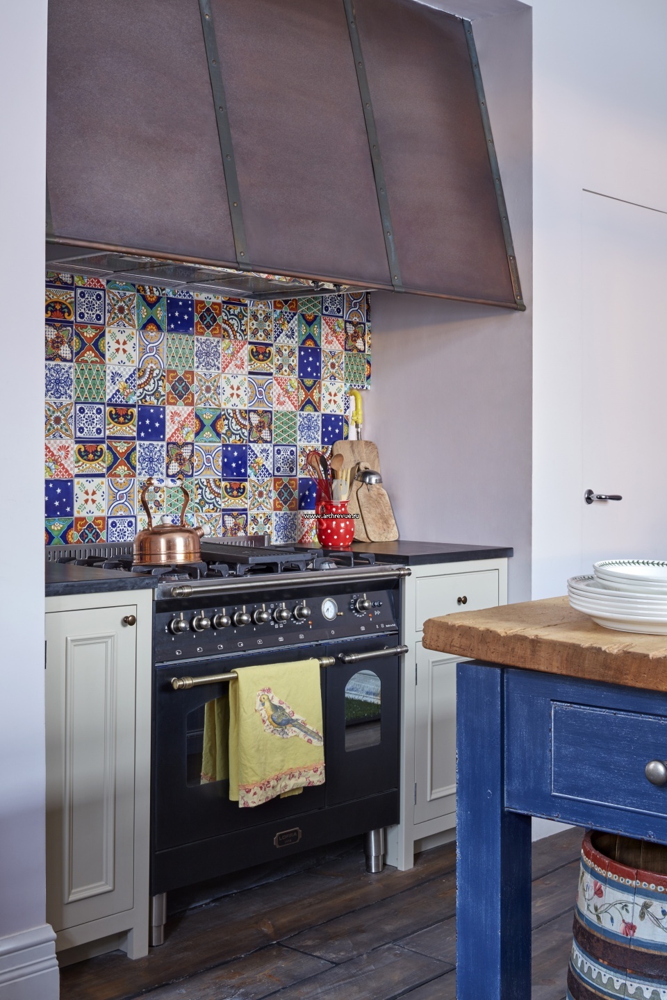 Интерьер кухни. «Фартук» облицован разноцветной керамической плитой в стиле кантри. Плита, Lofra.