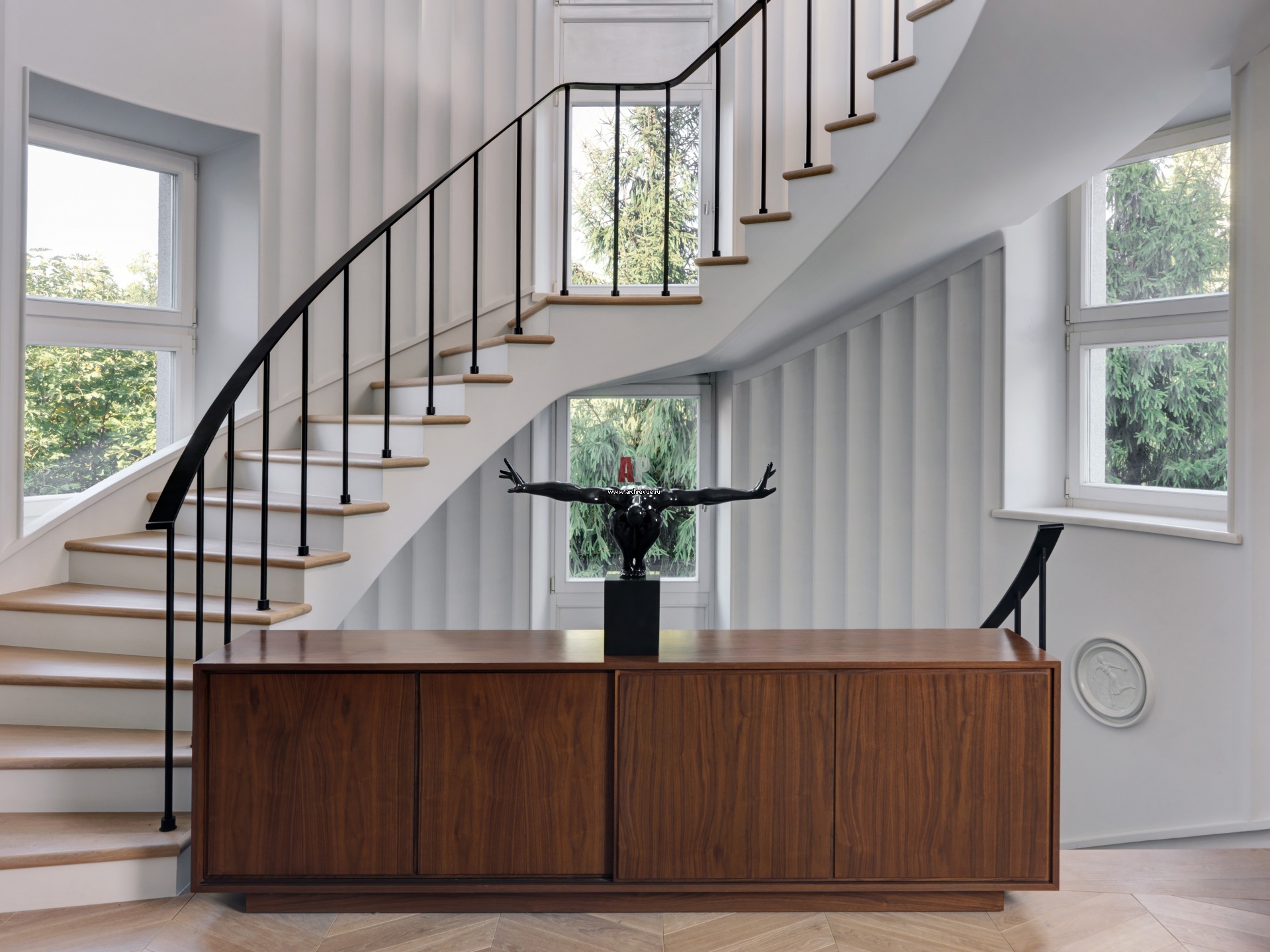 Лестничный холл второго этажа. Винтовую лестницу авторы проекта видоизменили, придали ей черты эпохи 1930–1940-х годов.