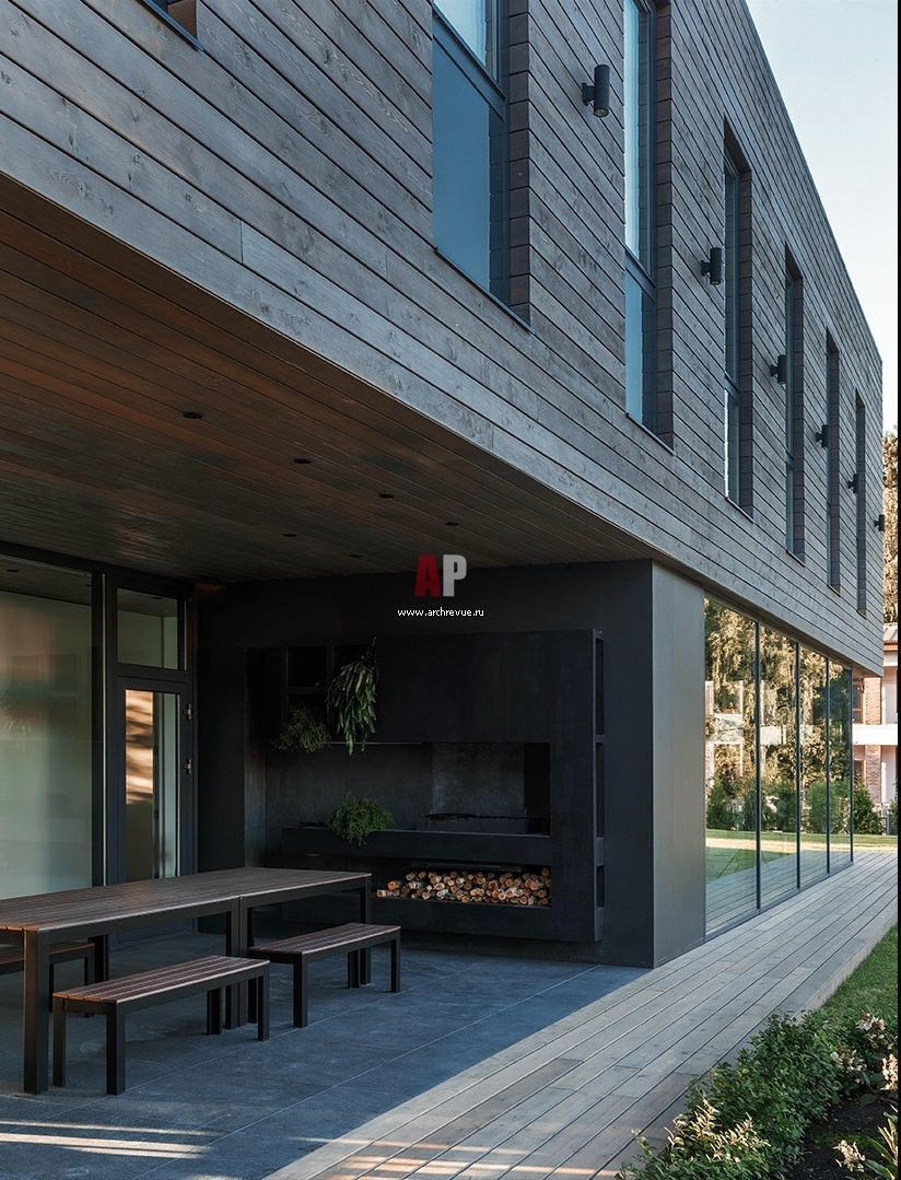 Под нависающим объемом второго этажа расположена веранда с камином.