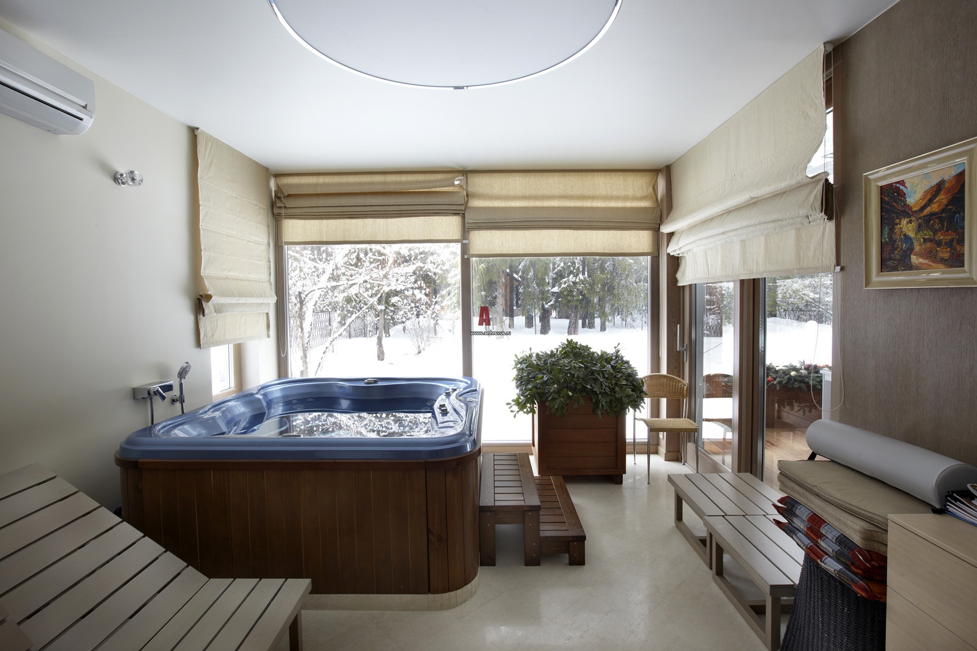 Зона SPA на первом этаже обращена на уединенный живописный участок. Большая ванна с гидромассажем размещена возле панорамных окон.