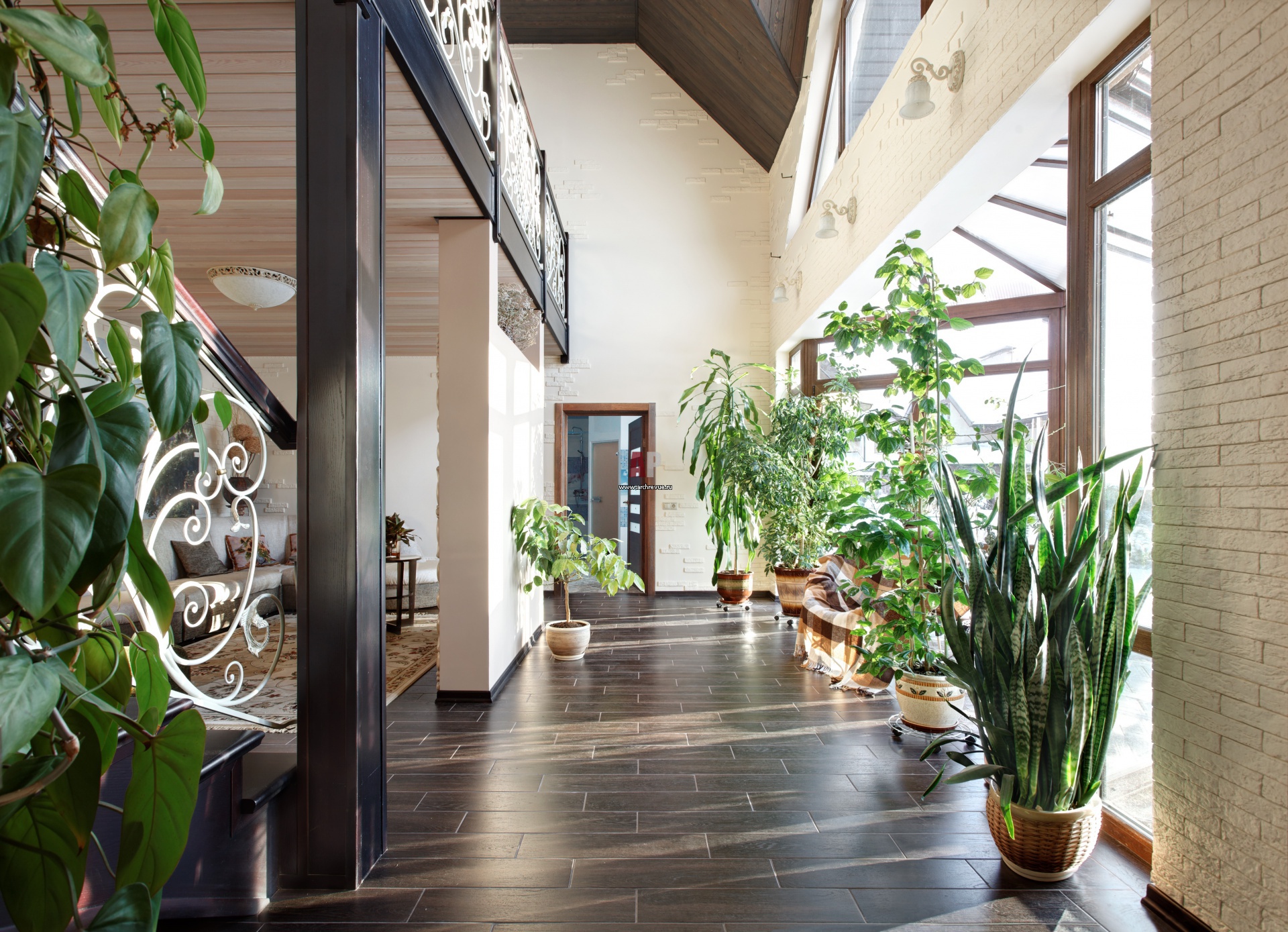 Фото интерьера зимнего сада в частном доме. Стеклянный полукруглый эркер дает много солнечного света. Полы – половая доска из темного дуба с седыми прожилками.