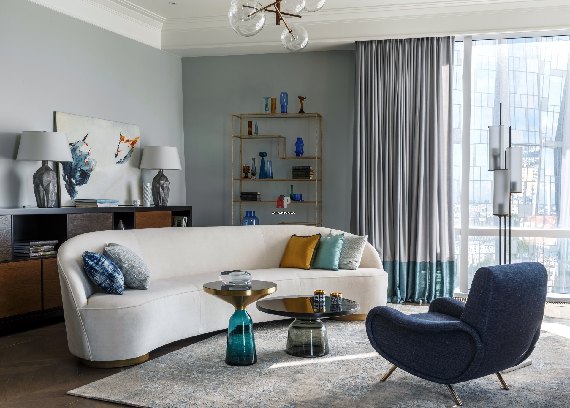 Гостиная в стиле mid-century. Диван, TV тумба, стеллаж, на заказ, по эскизам. Кресло, Cassina, модель Lady. Журнальные столики, ClassiCon.